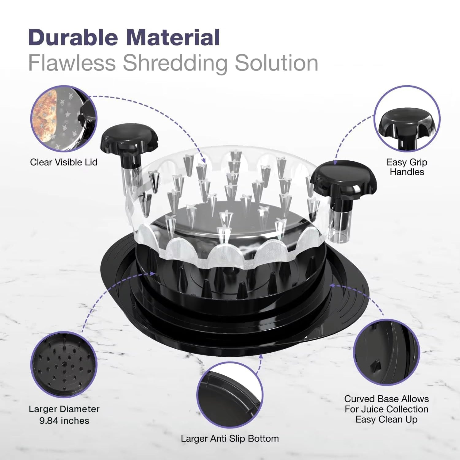 - 【Ergonomic & Comfortable Handle】Designed with an ergonomic, easy-grip handle that provides a secure and comfortable hold while twisting. The textured top improves control and reduces hand fatigue, making meat shredding faster, safer, and more effortless—even during extended use. The clear lid lets you monitor shredding progress at a glance.