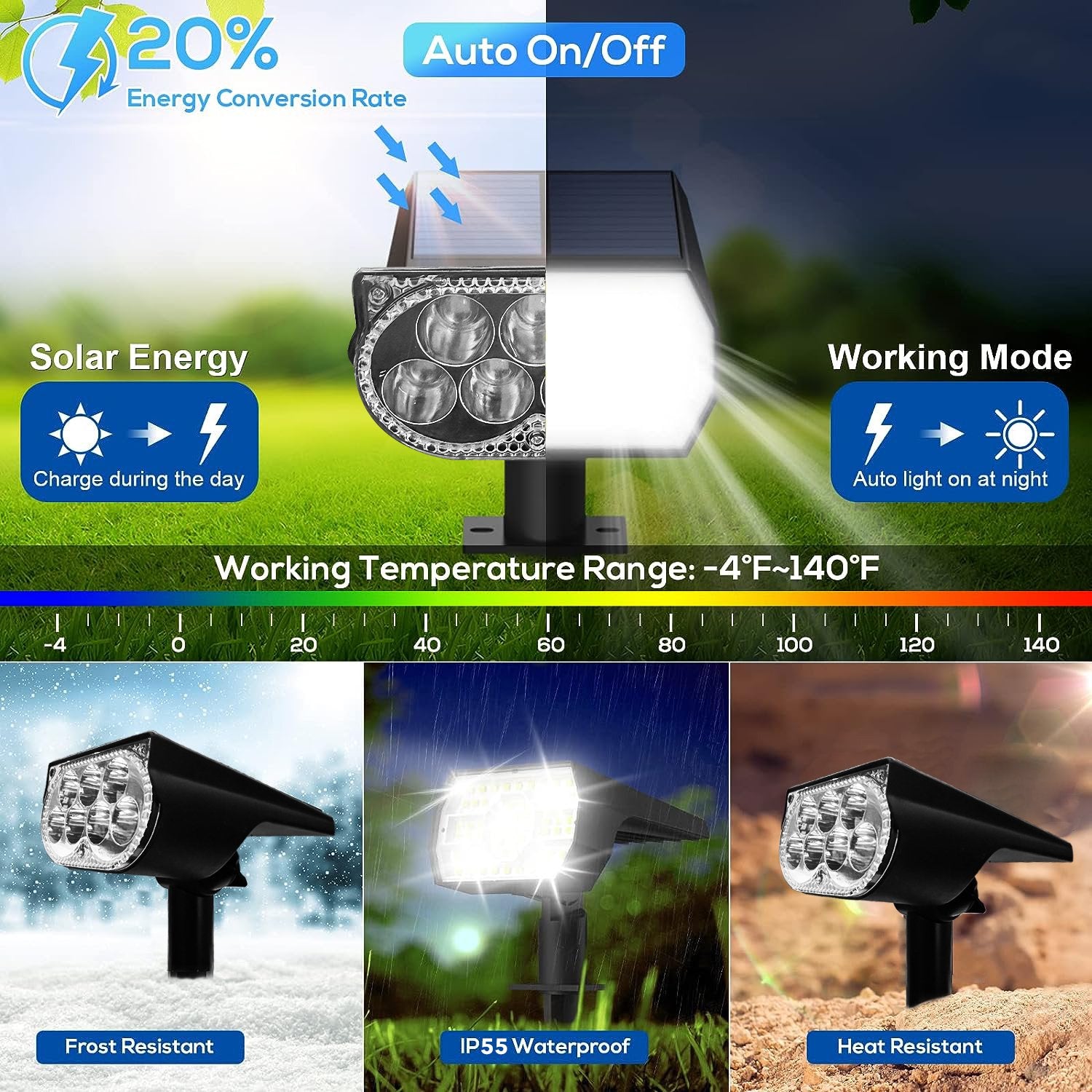- 【Waterproof】The IP55 waterproof rating allows the solar garden lights to withstand all kinds of bad weather such as rain, snow, wind and frost etc., maintaining light intensity and prolonging the service life. It is perfect for outdoor use.