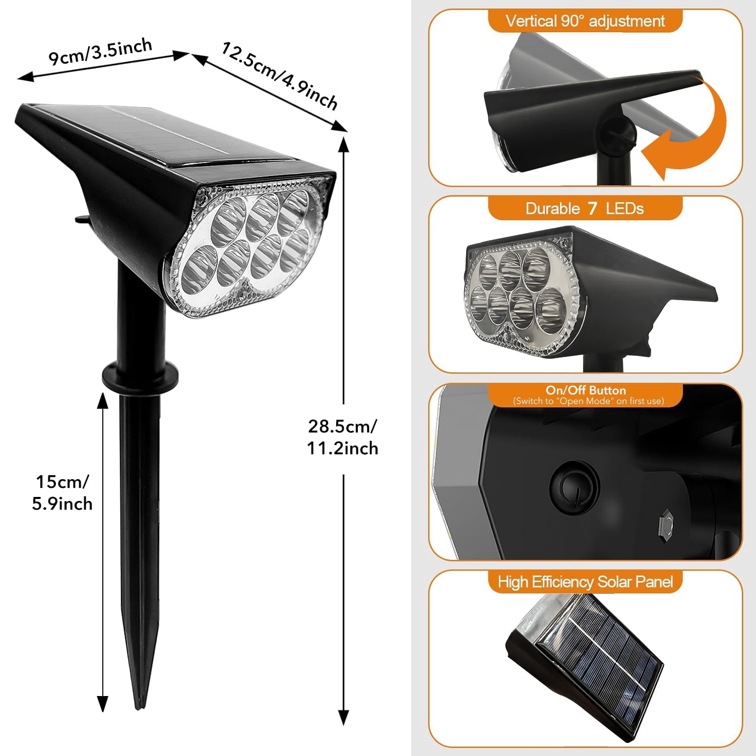 Solar landscape spot lights have a waterproof structure and are suitable for outdoor applications such as gardens, courtyards, porch, pool edges, etc. The illumination time of 7 LED lights is 8-10 hours, efficient and long-lasting. It automatically turns on when night falls, creating a warm atmosphere while providing just the right lighting for your beautiful home and garden. It is powered by solar energy, energy-efficient, and completely wireless. Simple modern design is perfect for any space.