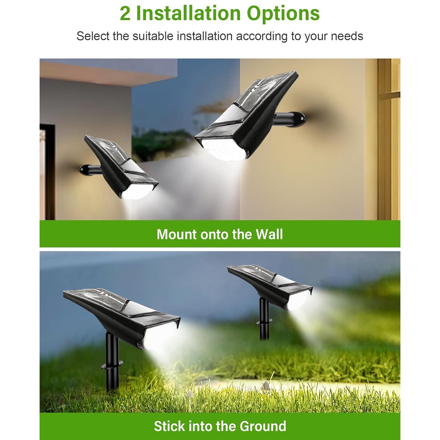 - 【2 in 1 Function & Easy Installation】These outdoor solar lights can be used as landscape lights or wall lights. Setting up is both fast and simple. Insert it into the grass using a pointed bracket and use it as a solar landscape light. Alternatively, install it on the wall with the accompanying screws and shine light from above. Look at every corner of your yard.
