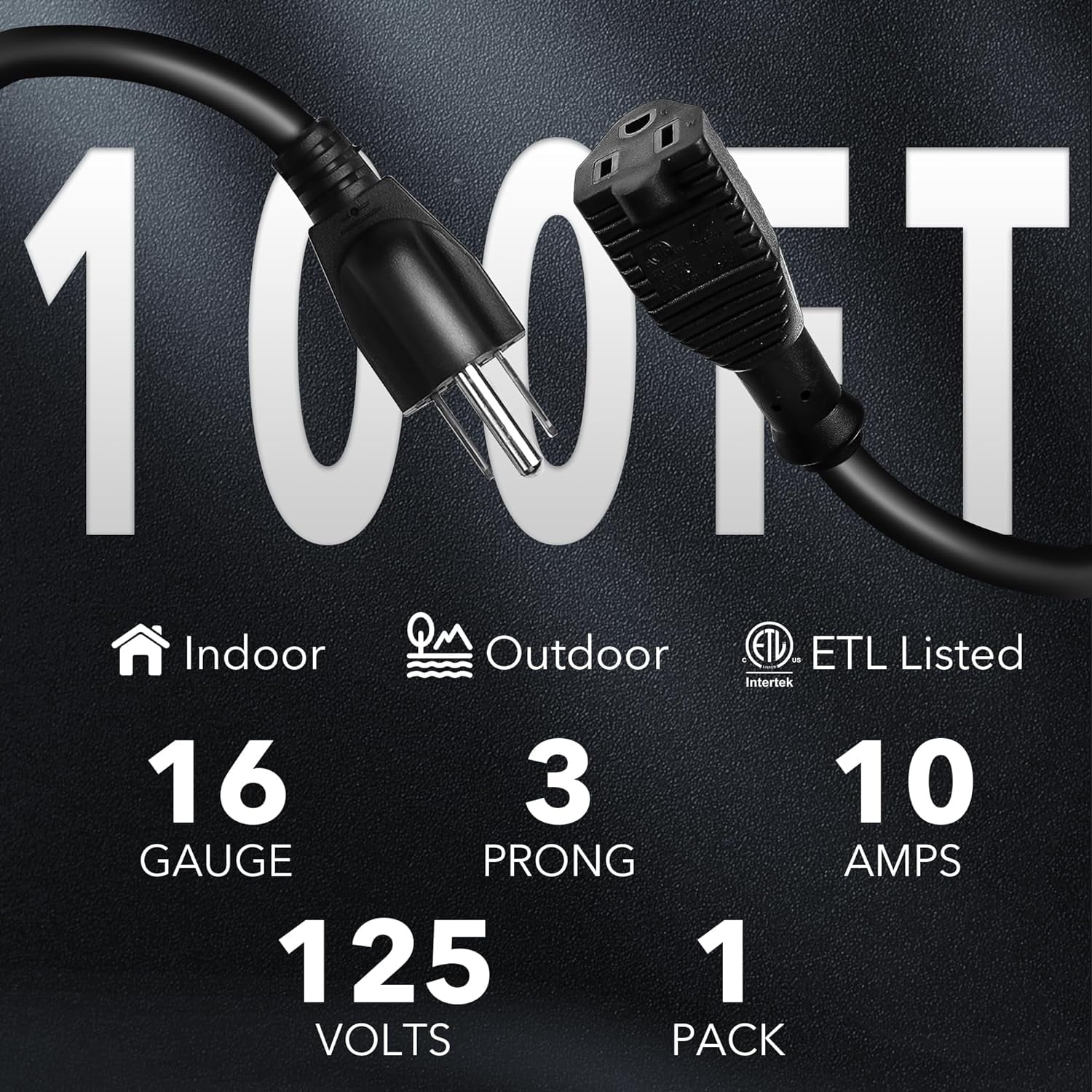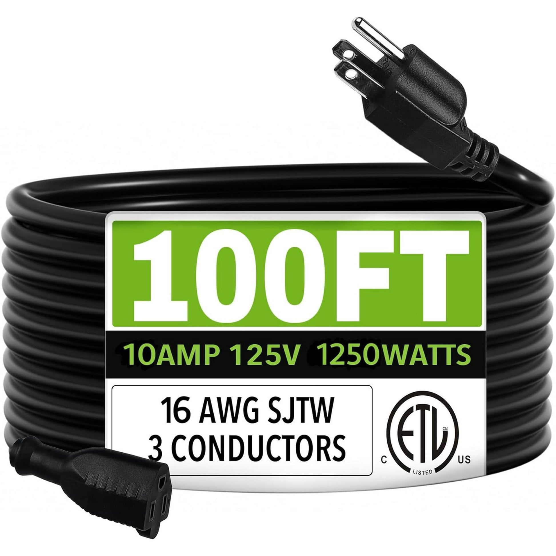 - 【Suitable for outdoor】This 100-feet black extension cord with 10-amp, 125-volt, 1250-watt rating is compatible with most appliances and devices and is also perfect for Halloween, Christmas decorations!