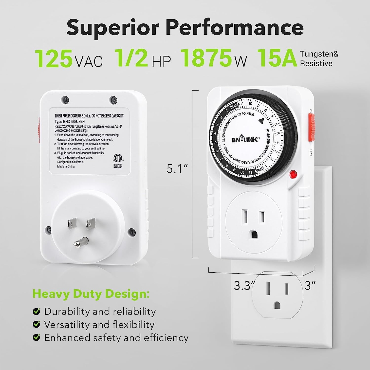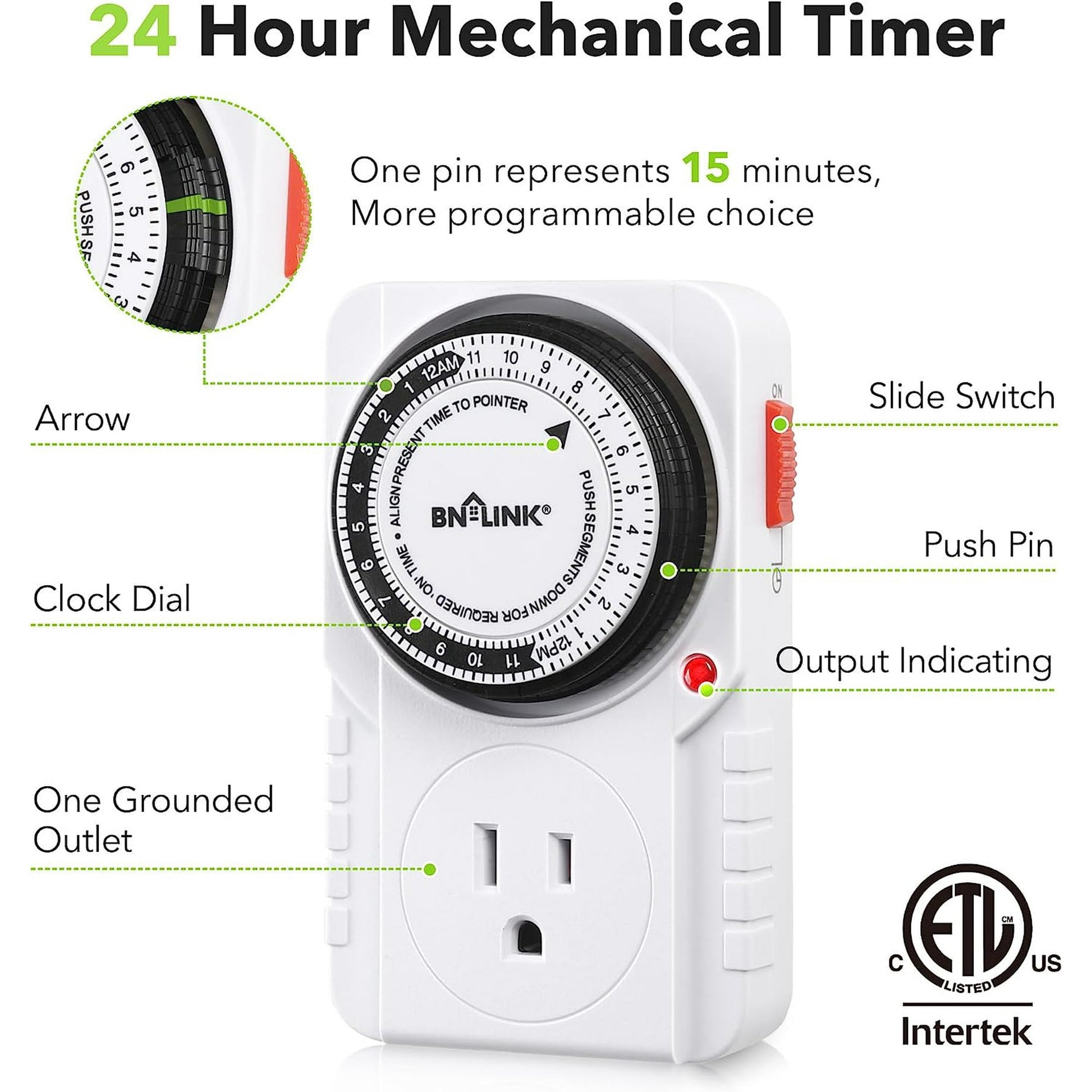 BN-LINK 24 Hour Heavy Duty Plug-in Mechanical Timer Outlet Grounded is essential for all hydroponic system applications. Programming can be set for multiple on/off events, so your entryway will be lit when you arrive home. This plug-in timer provides up to 48 on/off settings per day and the cycle repeats every 24 hours. Easy to set in 15 minute intervals with never-lose segment pins that can't be removed or lost. Use the manual override button to turn the timer on or outlet on, so you don't have to delete any preprogrammed settings. Plug fans, lamps or holiday lights in and set the timer to turn the device on and off so it won't remain on when unused. The Timer provides the safety and security as you come home to a lighted house. No fumbling for the light switch or tripping over obstacles in your way, the lights are on when you walk in the door. This timer is compatible with compact fluorescent lighting, LED bulbs.