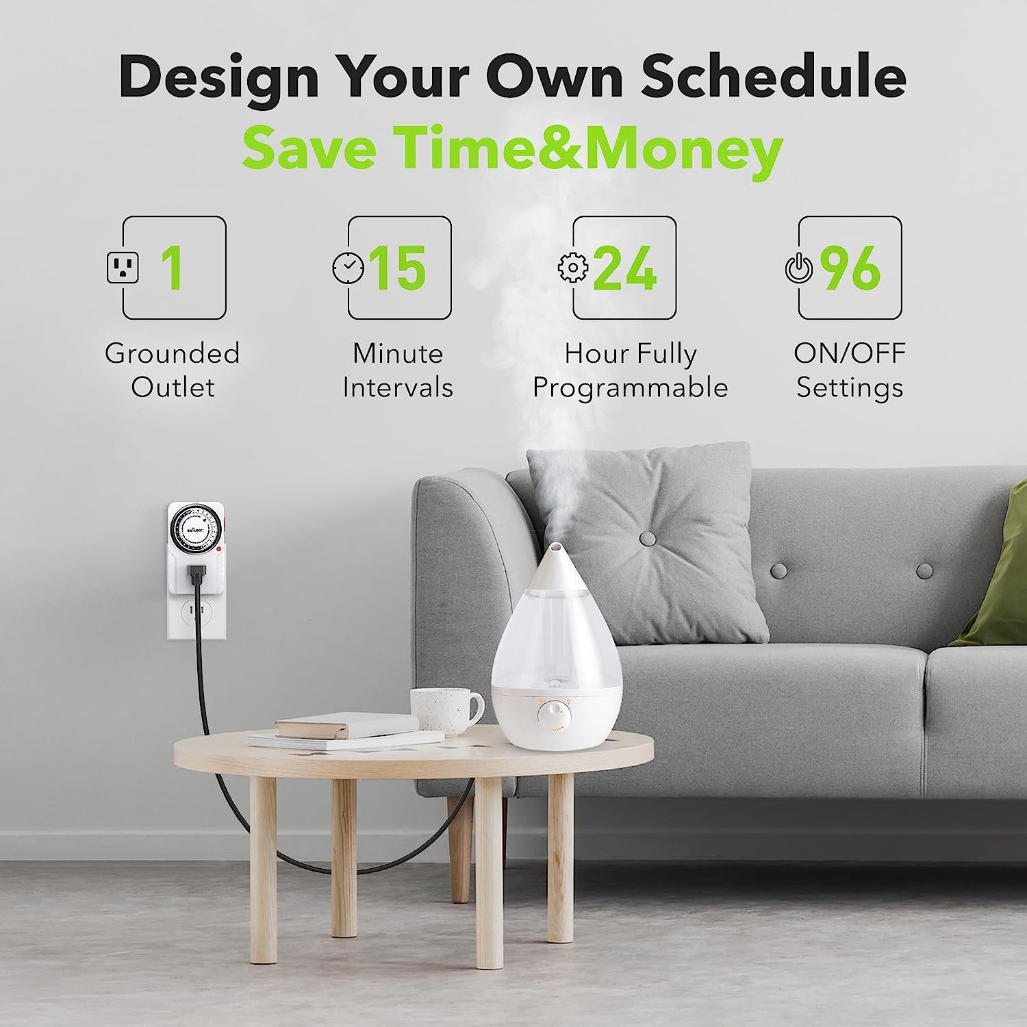 - ✓ VERSATILE & CUSTOMIZABLE: Each pin represents 15 minutes for added customization. Set up to as many as 48 ON/OFF programs to automate your home appliances. Timer can also be used as an interval timer.