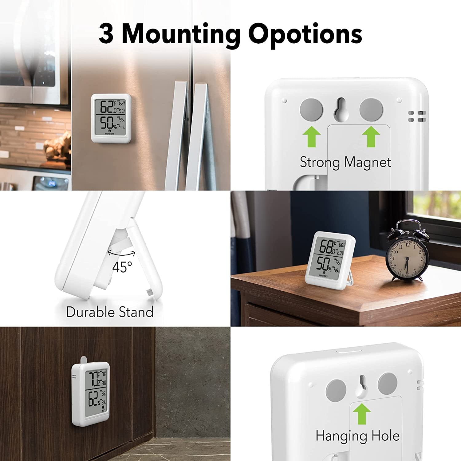- ??【Convenient Design】This Digital Hygrometer is designed for convenience. It comes with a desktop stand, magnetic back, and hanging hole. This indoor room thermometer offers a ℉/℃ selector.