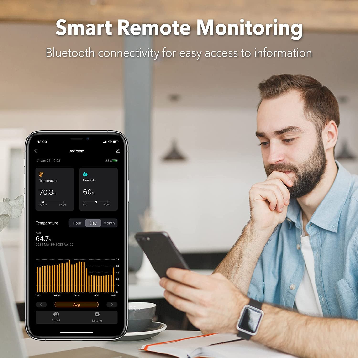 - ??【Smart Recording & Analysis】Paired with a dedicated mobile application(BN-LINK Smart), users can effortlessly view real-time temperature and humidity data on their smartphones or tablets via Bluetooth connection. The app also offers trend analysis charts, enabling you to gain better insights into and manage the indoor environment. Furthermore, the smart hygrometer provides historical data storage and allows you to conveniently send the data to your email.