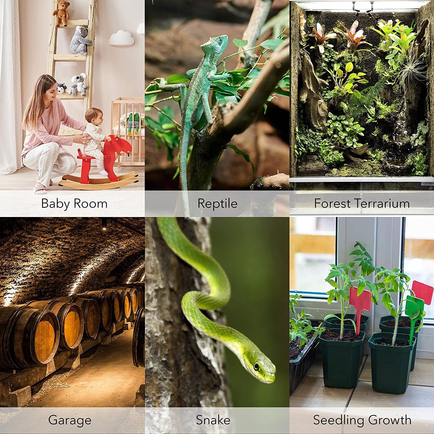 - ??【Versatile Applications】This room thermometer hygrometer is widely applicable to various settings, including homes, offices, baby rooms, greenhouses, warehouses, and laboratories. It caters to different environmental monitoring needs and can be extensively used for monitoring reptile habitats, plant cultivation, and goods storage, among other applications.