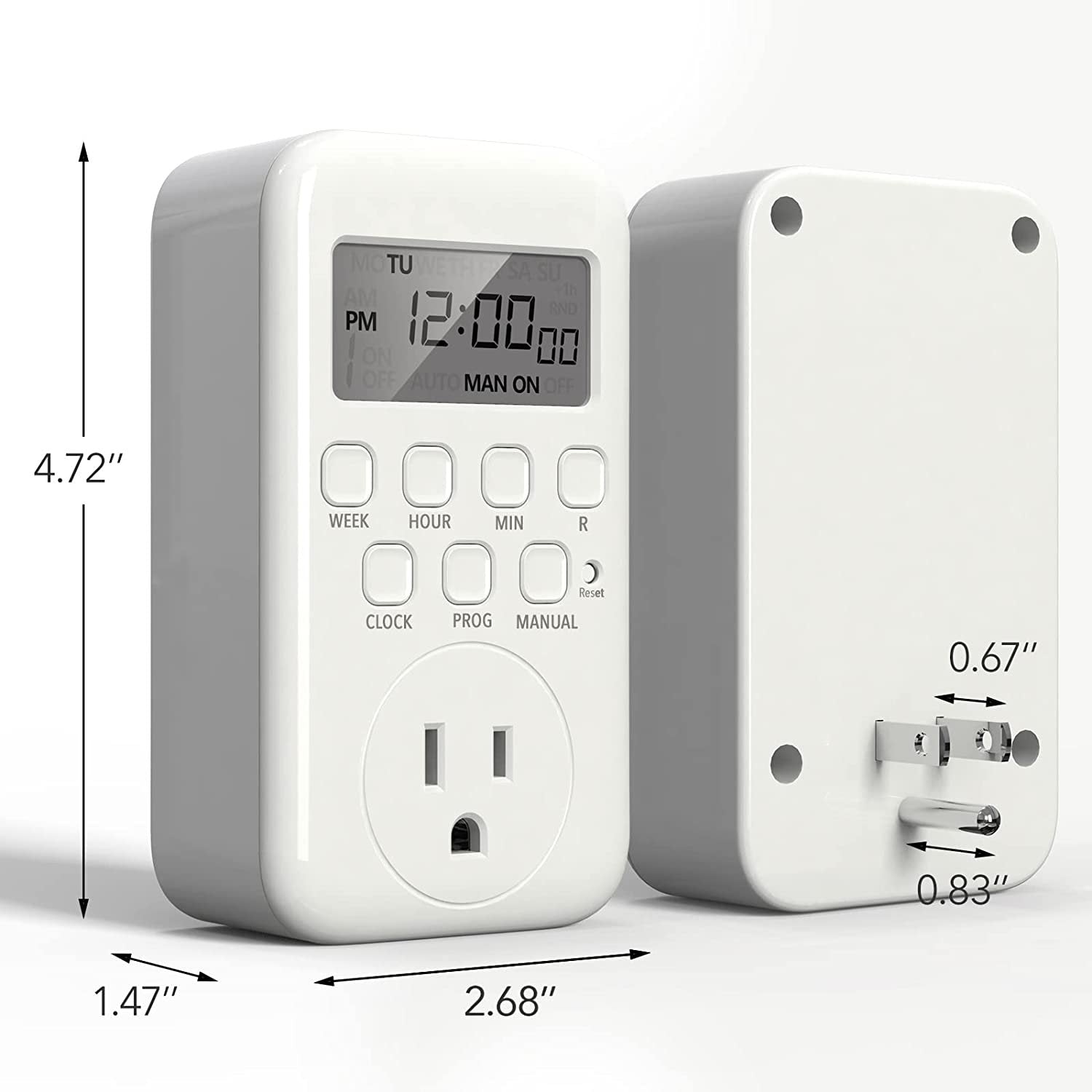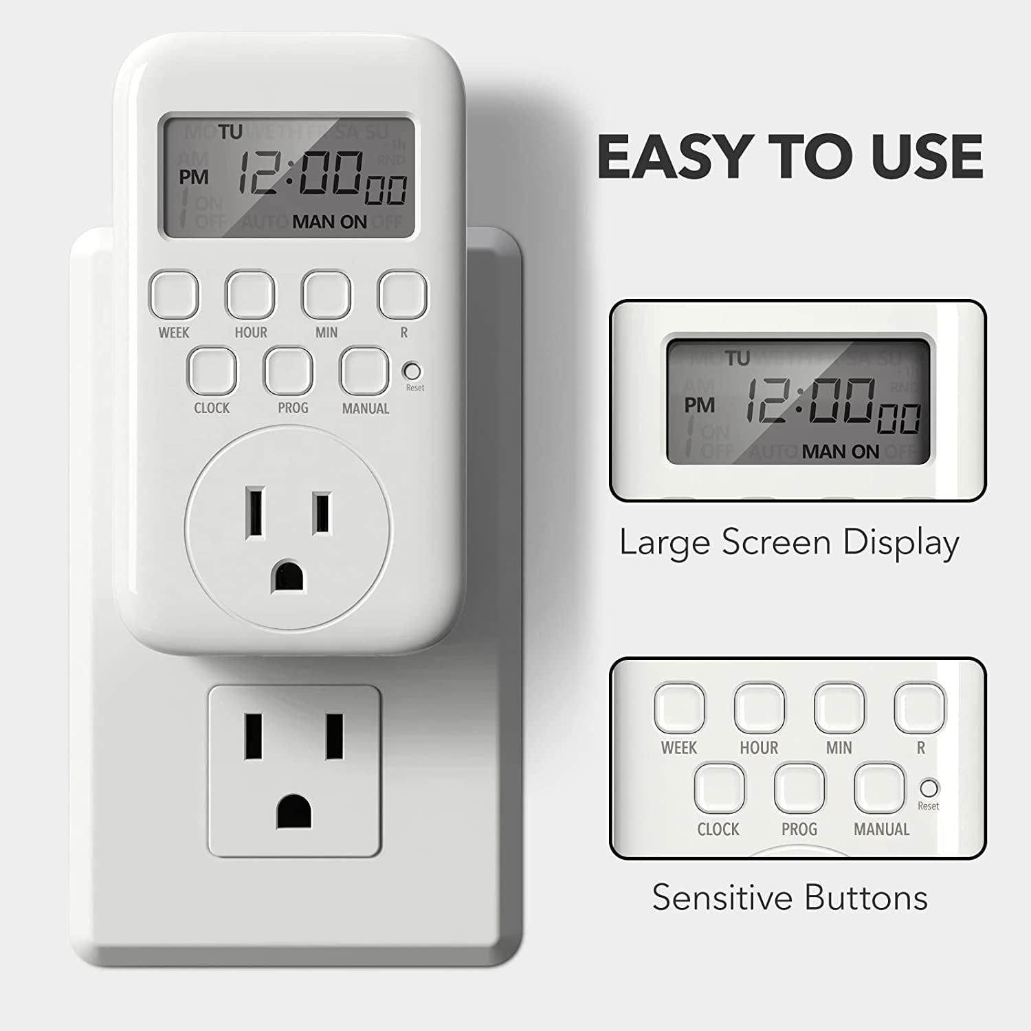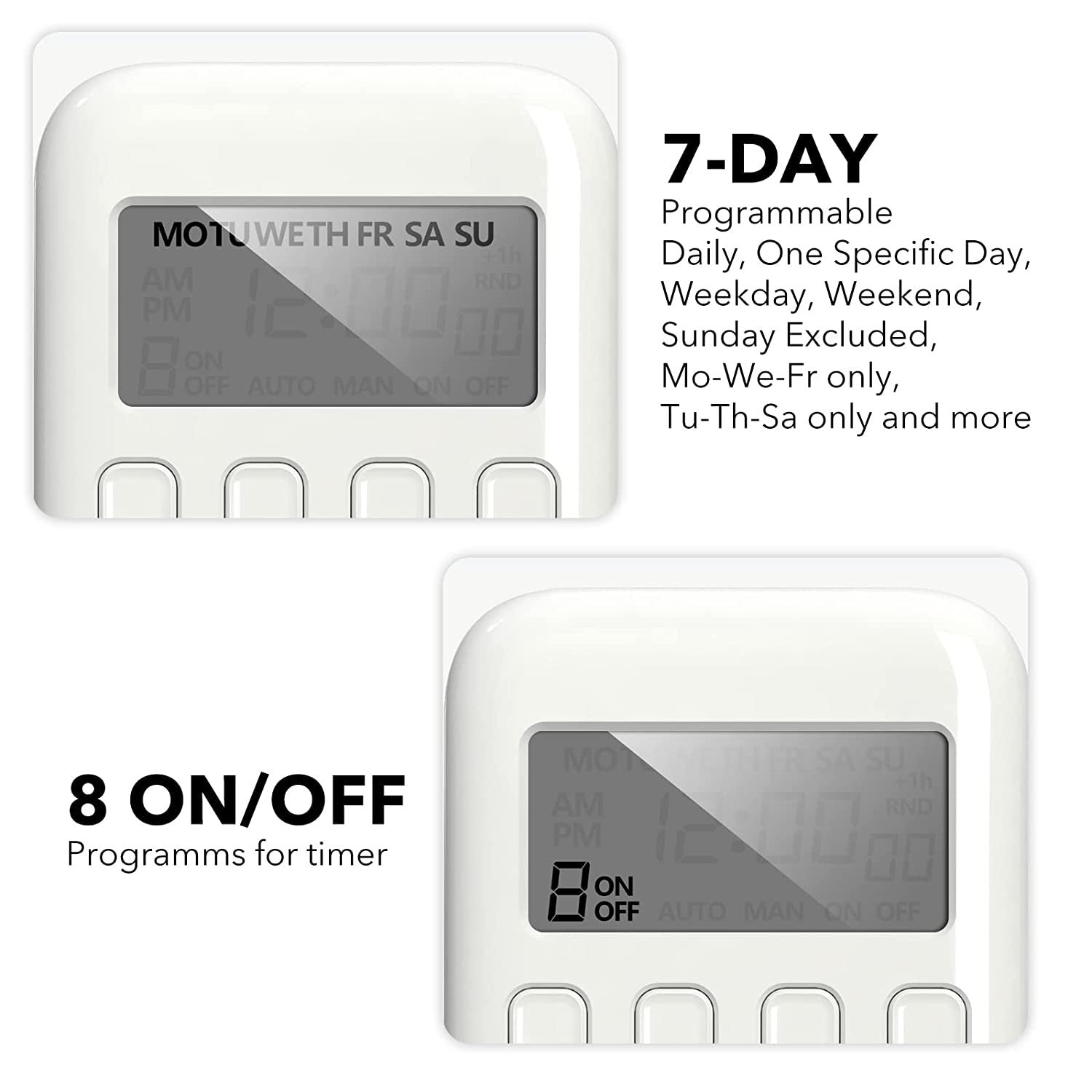 - ✓ VERSATILE & CUSTOMIZABLE: The indoor timer owns flexible buttons and a clear big display screen. Easily set up to 8 on/off programs for the 3-prong grounded outlet timer. Very easy to program and use. Settings can be as short as one minute