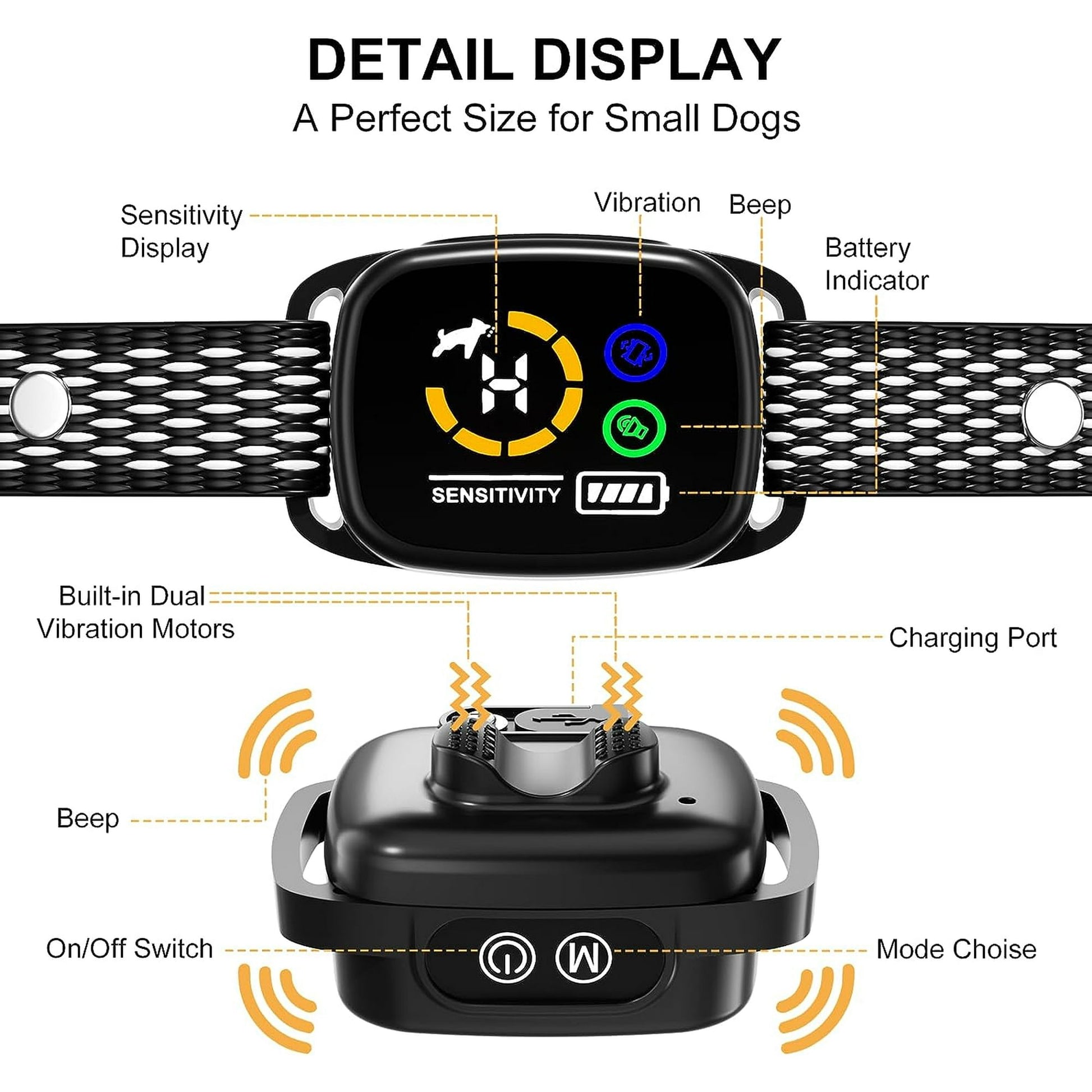 - 🐕【Safer Humanized Setting】The dog bark collar has 2 working modes: Beep and vibration. 6 adjustable sensitivity levels; Just press the M button to switch the mode at will, you can enjoy quiet time