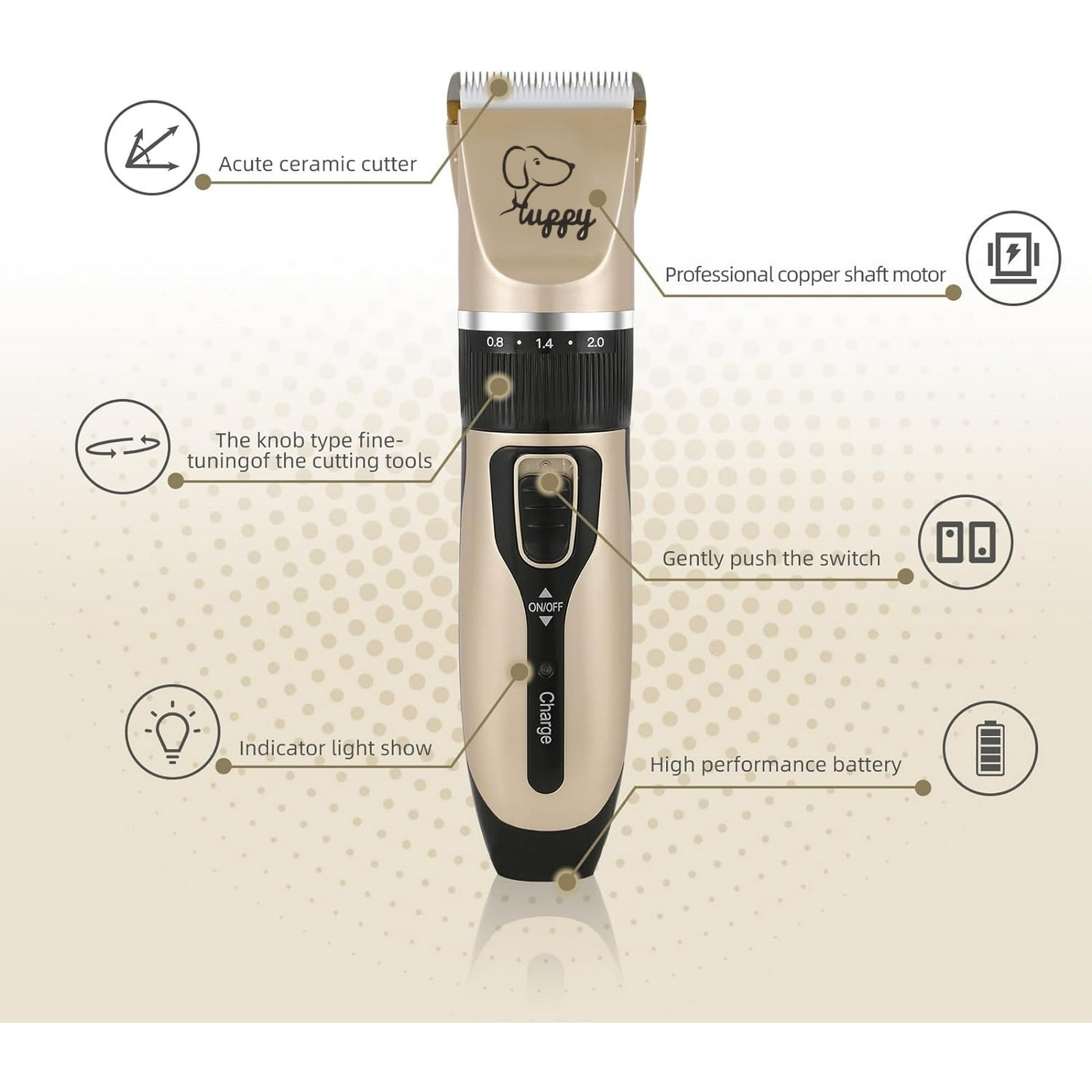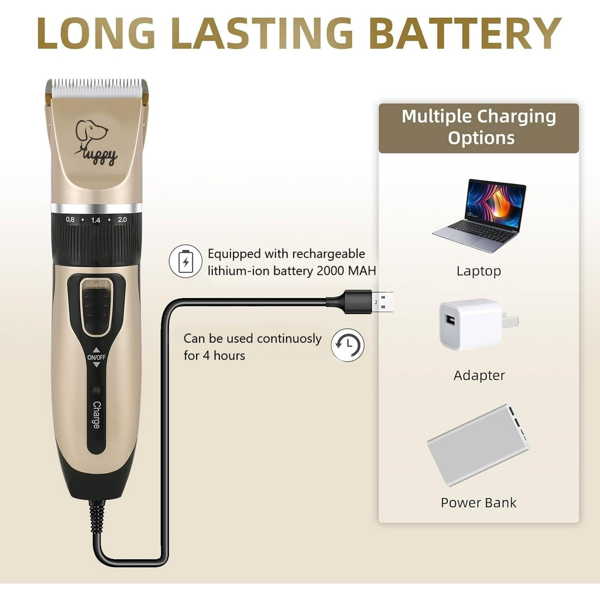 - 【Built-in Batttery】Rechargeable dog trimmer with built-in battery is good for exceptional flexibility. It can also be used when charging so you don't have to worry that it will stop working and have half groomed dog.