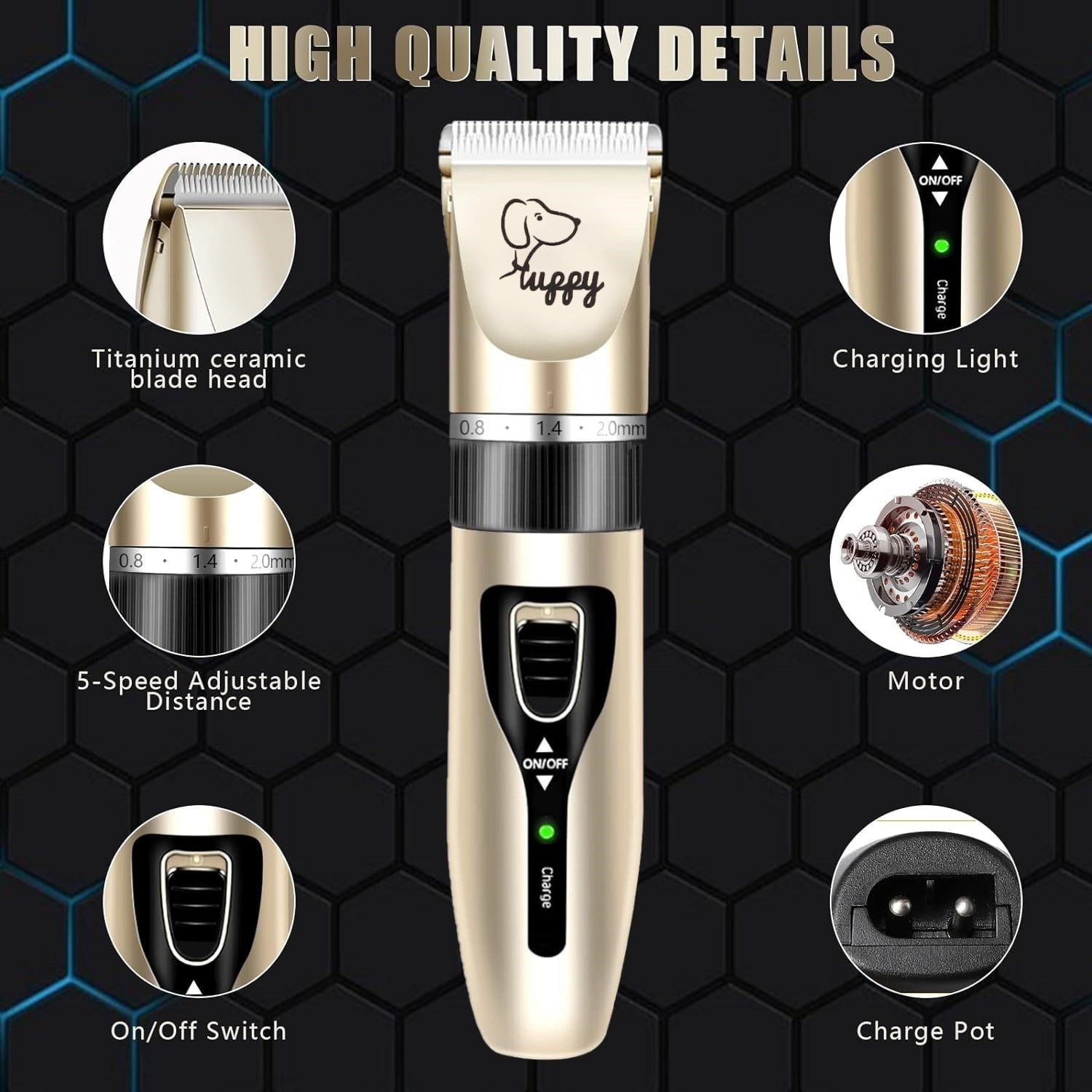BN-LINK Dog Grooming Kit Clippers, Low Noise Rechargeable Electric Pet Hair Thick Coats Clippers Trimmers Set, Suitable for Dogs, Cats, and Other Pets (Gold)