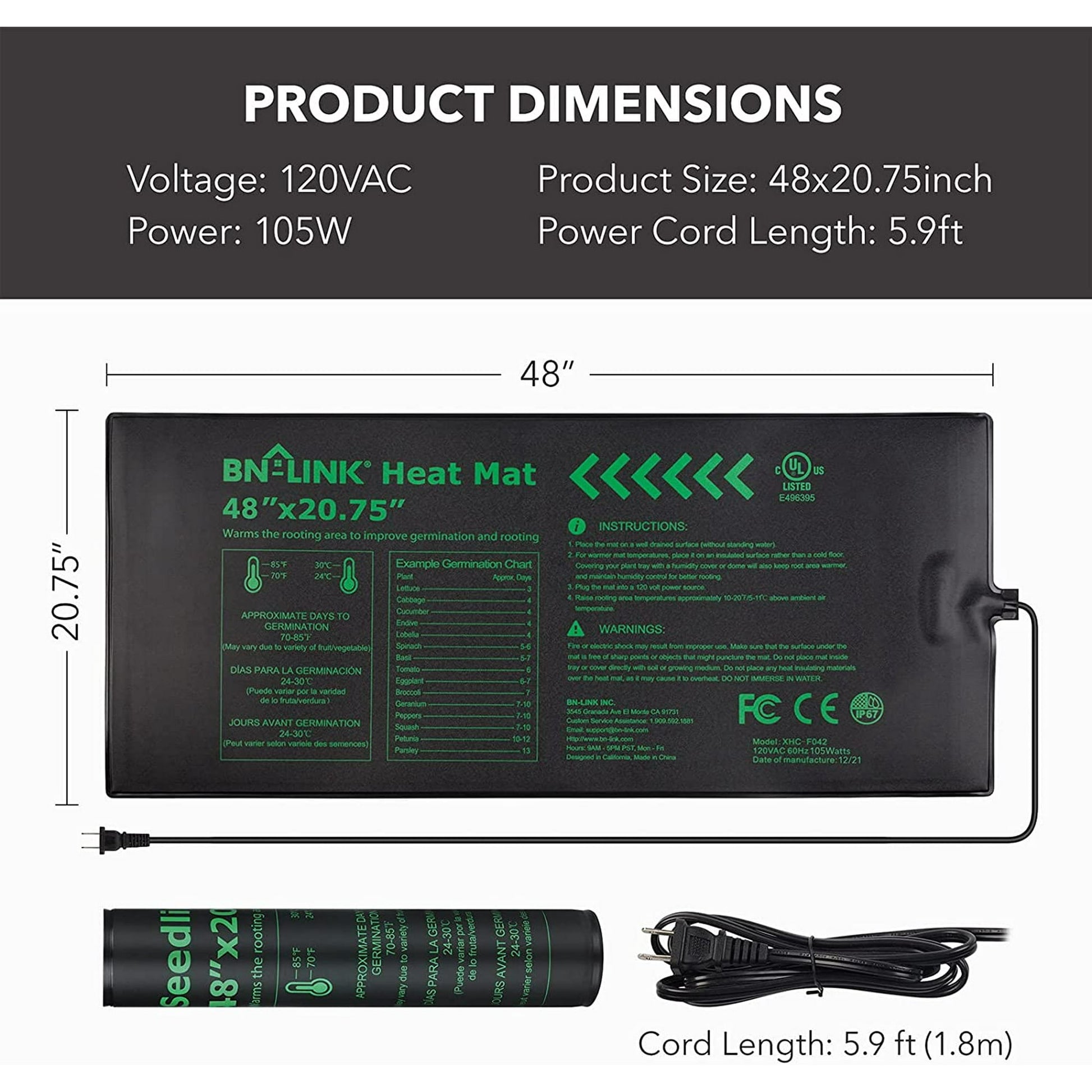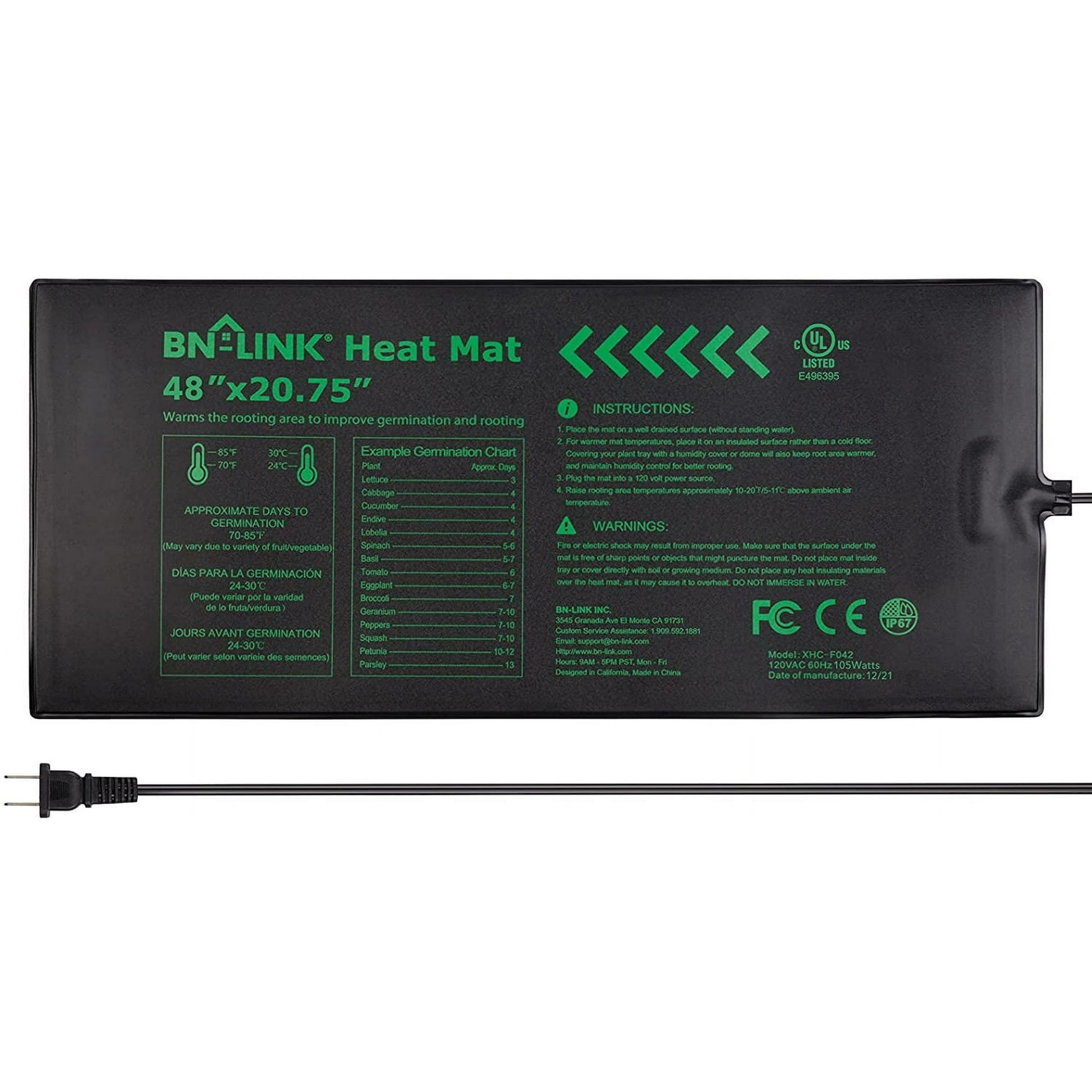 - 【LARGE SIZE AND SAFE】48" x 20.75", 105 Watts. The mat can support four standard plastic growing trays. Each unit comes with BN-LINK’s strong 15-month warranty.