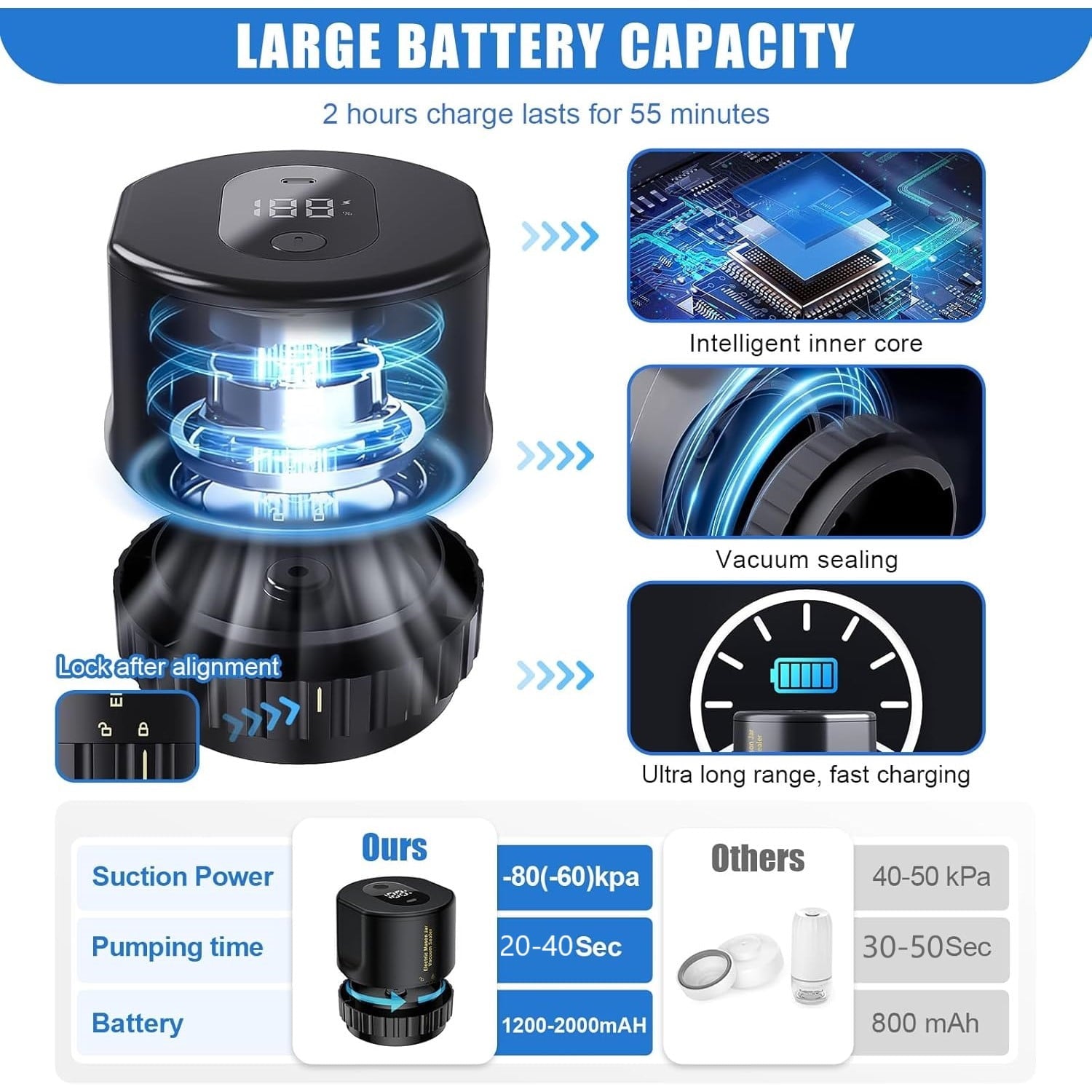 - 【Portable and Rechargeable Vacuum Pump】Unlike traditional vacuum pumps with cords and tubing, this compact rechargeable sealed canister is cordless and portable, It is an ideal companion for traveling, camping, and picnics.