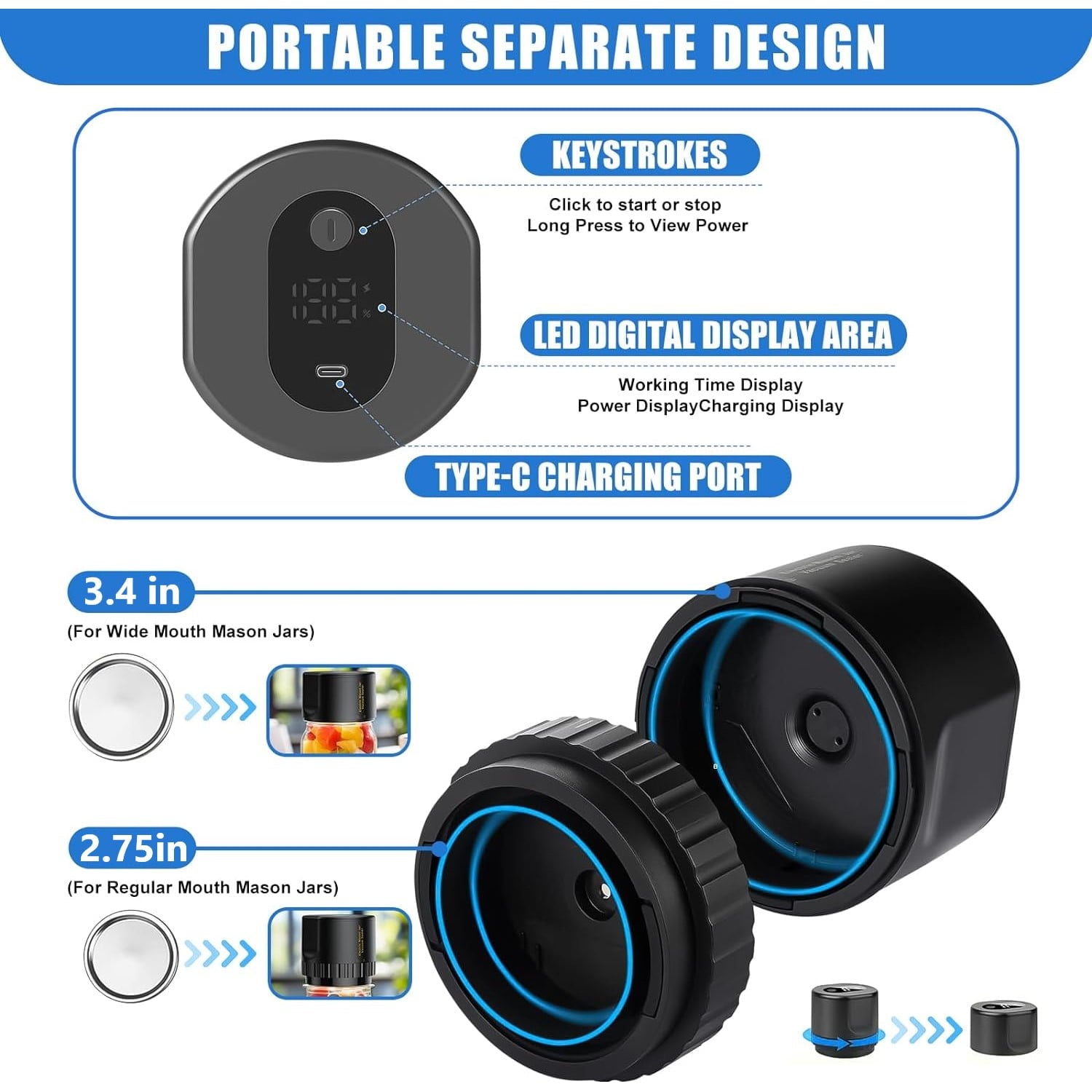 - 【Large Led Display, One-Button Operation】 Upgraded high capacity battery can be fully charged in only 2 hours for long time use. The jar vacuum sealer with built-in LED display simplifies the sealing process. One-touch activation seals food in over 20-40 seconds, freeing your hands from manual pumping.