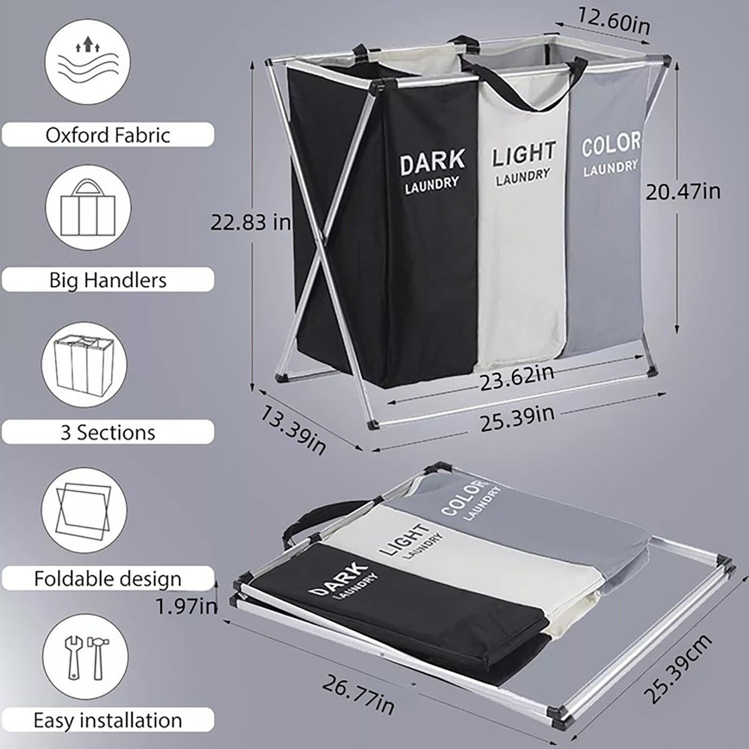 Stay organized and make laundry day easier with our 3-Compartment Collapsible Laundry Basket. Perfect for homes, dorms, or apartments, this laundry basket allows you to sort your laundry into three sections for efficient washing. Crafted from durable 600D Oxford fabric and a sturdy frame, this sorter is built to last and simple to assemble. Whether you're organizing laundry by color or fabric type, this basket is a convenient, space-saving solution.