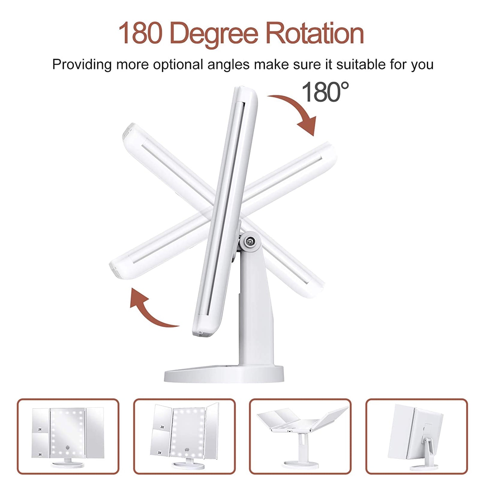 - 【1X,2X,3X Magnification】Lighted makeup mirror has 3 panels magnifying and wide-angle viewing; see clearly your face and make a flawless makeup, suitable for desk makeup and handheld use.