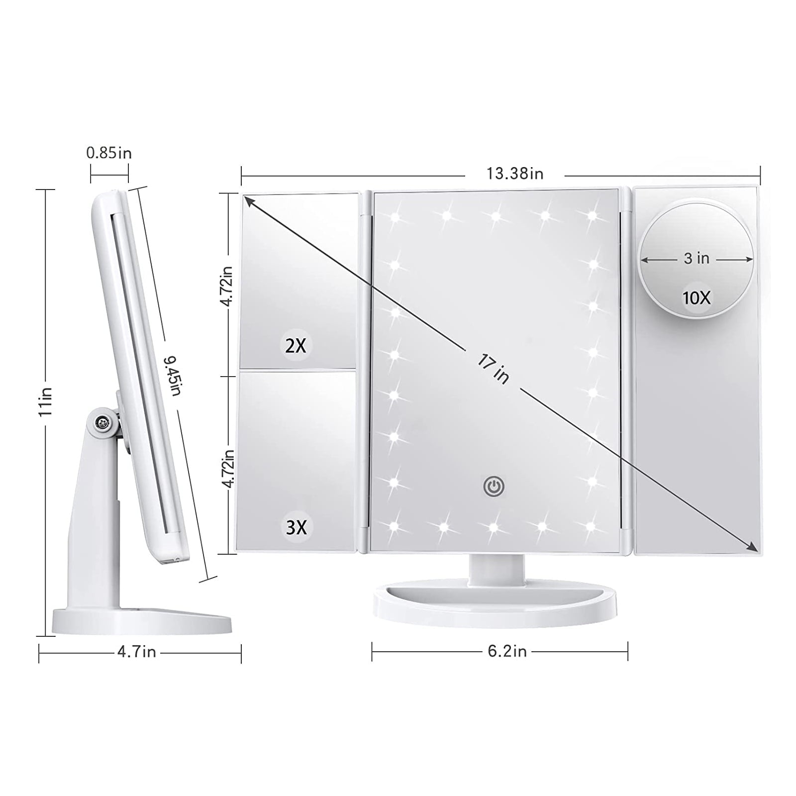 The color of the lighted makeup mirror is white, one of the most popular colors of the female. The tri-fold lighted makeup mirror, featuring one of the brightest lighted mirrors with 22 LED bulbs, tri-fold makeup mirror has an adjustable brightness that can be used to accommodate your lighting needs. Hold the touch screen switch 3s can make the lights dim or bright. The makeup mirror can be rotatable that can be held at the angle you needed.