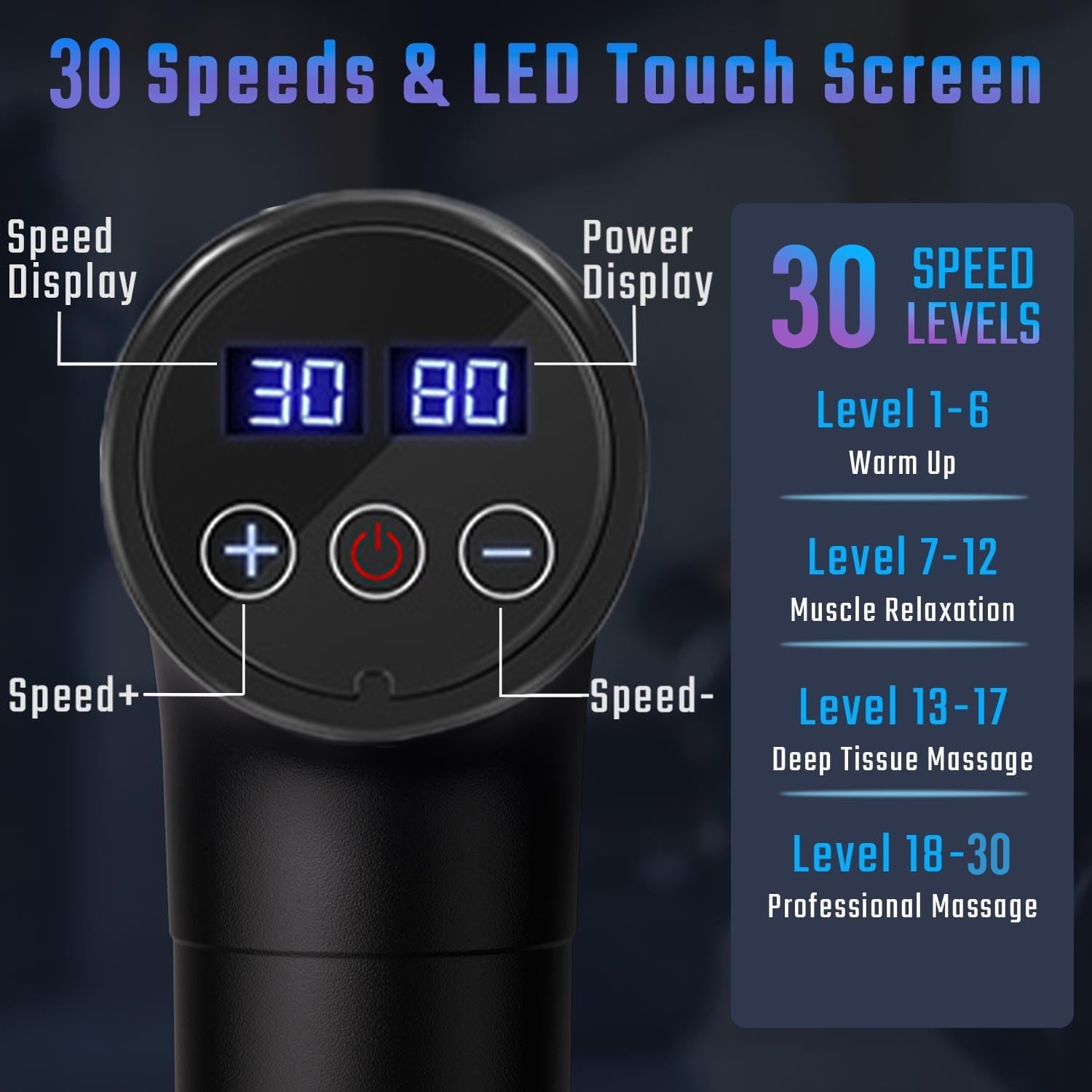 【30 Speed Levels & LCD Display】For different muscle soreness problems, the deep tissue massage gun is equipped with 30 speed levels, you can find the right amplitude to relieve all muscle soreness problems. The massage gun is equipped with a smart LED touch screen design and battery display design, allowing you to easily adjust the speed level and check the remaining battery power.