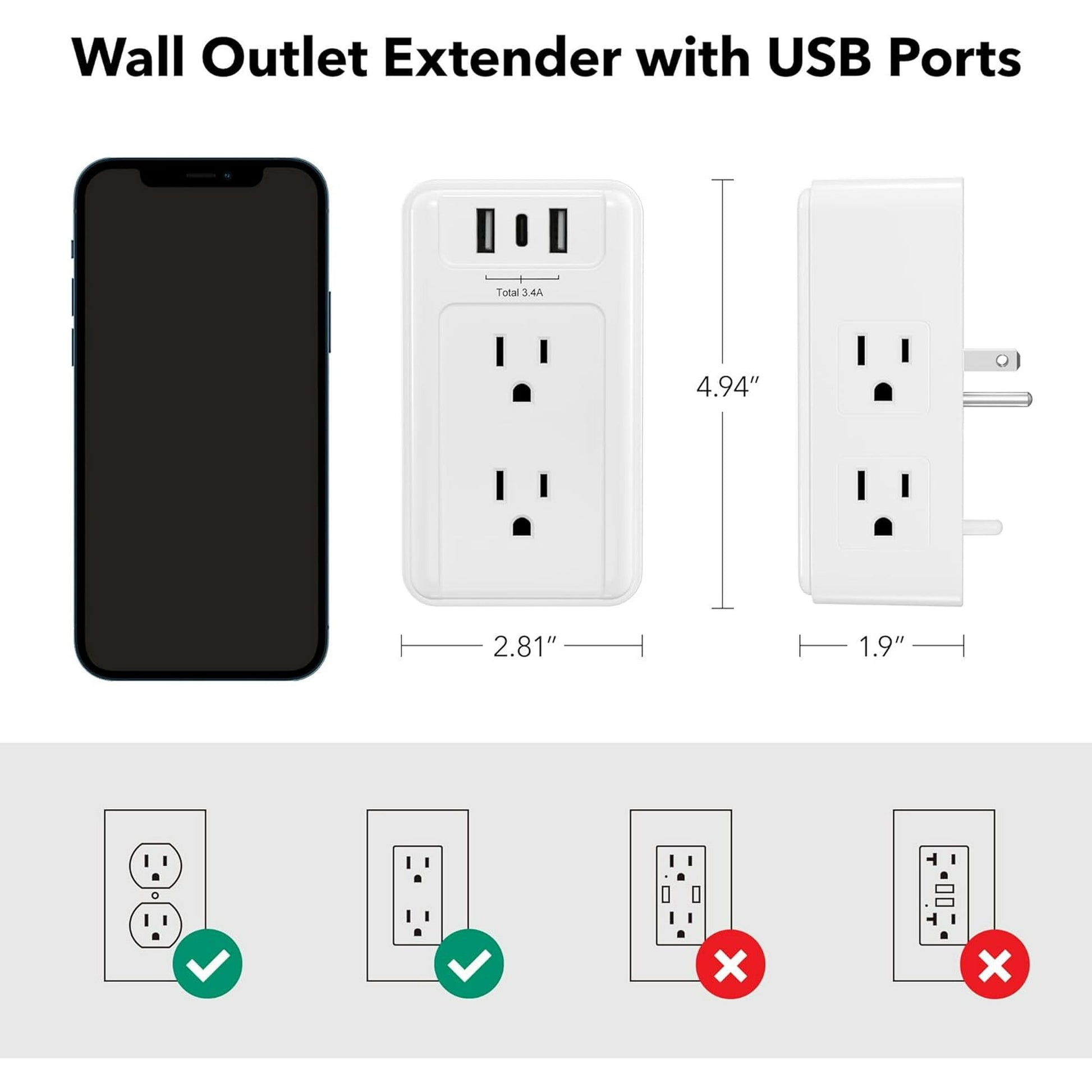 - 【Multi-functional Outlet Splitter】Our wall plug outlet extender has 6 adapter cables (15A/125V/1875W), 2 USB-A + 1 USB-C fast charging ports (total output 5V, 3.4A), replacing a standard socket to meet your multiple charging needs. This multi plug extension outlet plug has no indicator light. Please use it with confidence.