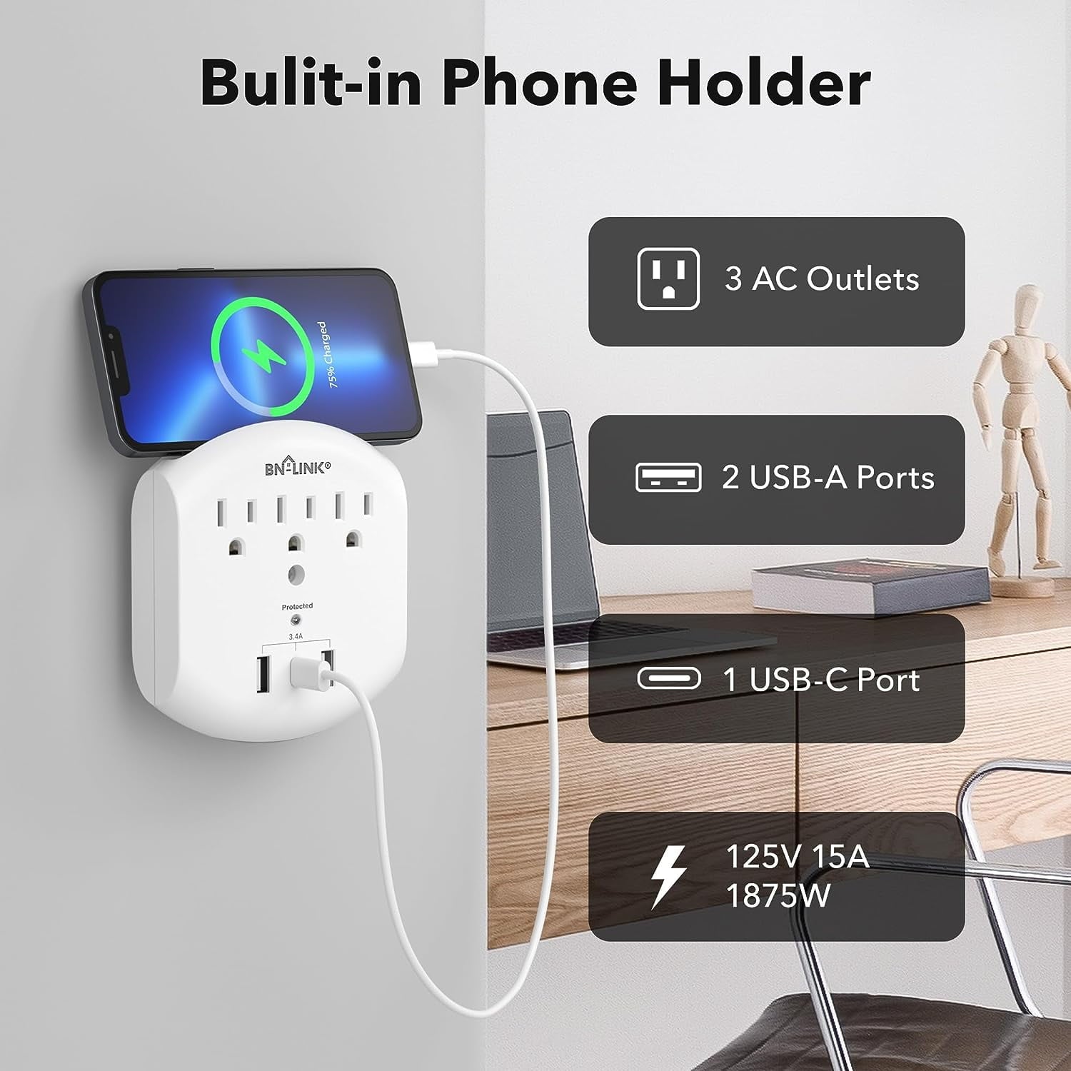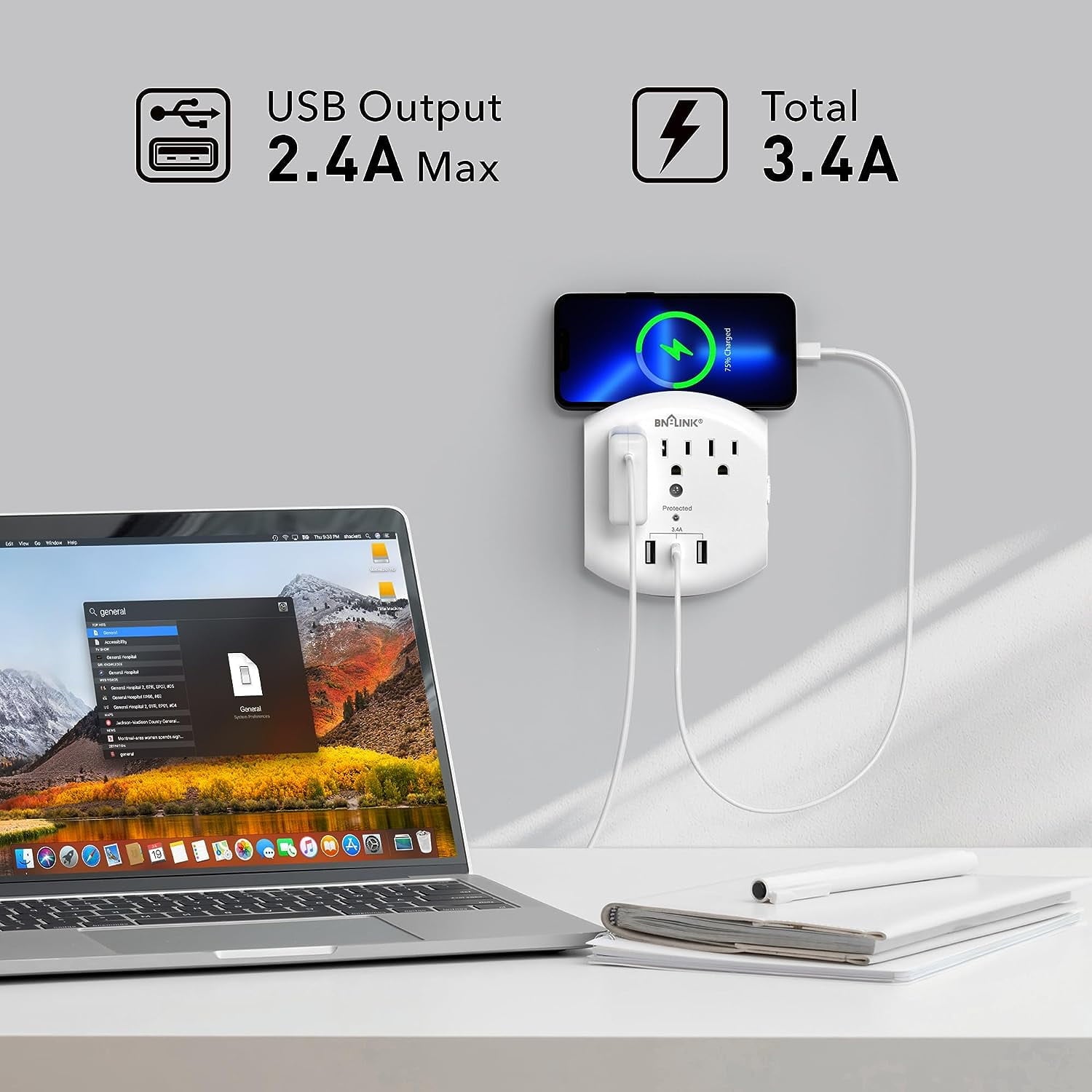 The BN-LINK wall adapter is easy to use. Plug it into the socket directly, then you can start charging. This wall-mounted USB outlet extender is designed for space-saving and convenient use.High-speed USB ports can detect charging devices automatically to provide the best charging speed for 3 devices at the same time. USB rating can be up to 2.4A per port and a total of 3.4A.BN-LINK USB Wall Charger Surge Protector is compact and convenient to carry. Whether traveling or using indoors, it will be easy to store in the suitcase and carry to different rooms in the home.