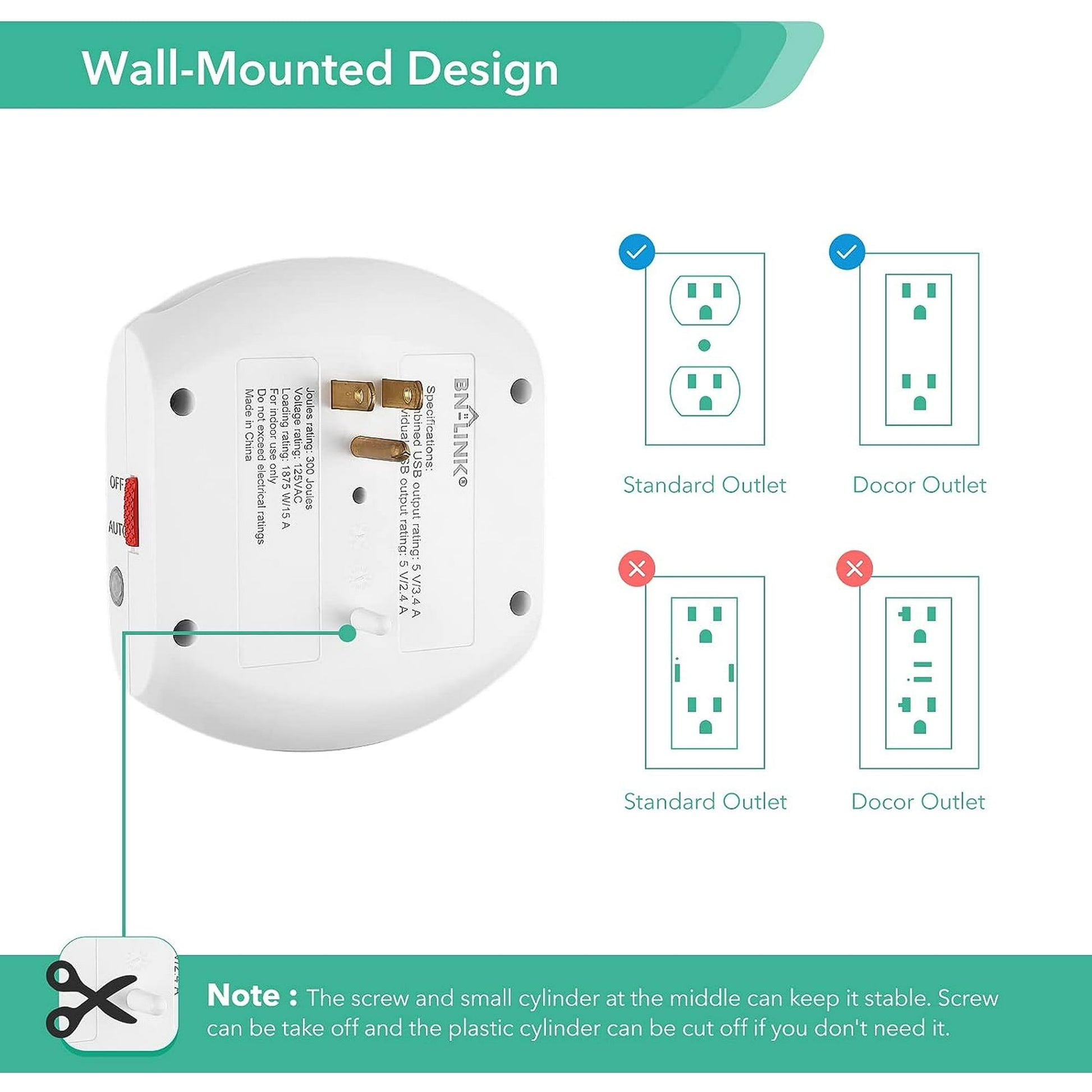 - 【Fast Charging】This USB plug outlet has 3 USB ports for charging. The individual output rating is 2.4A MAX. And 3.4A total rating will detect charging devices automatically to provide the fastest charging speed.