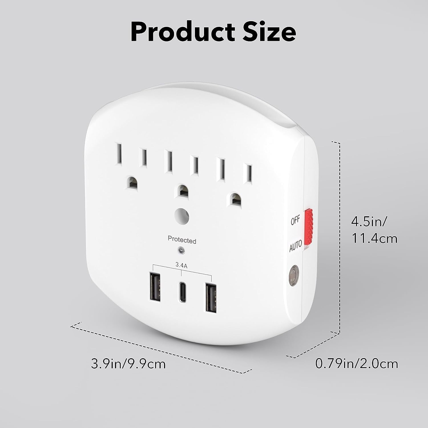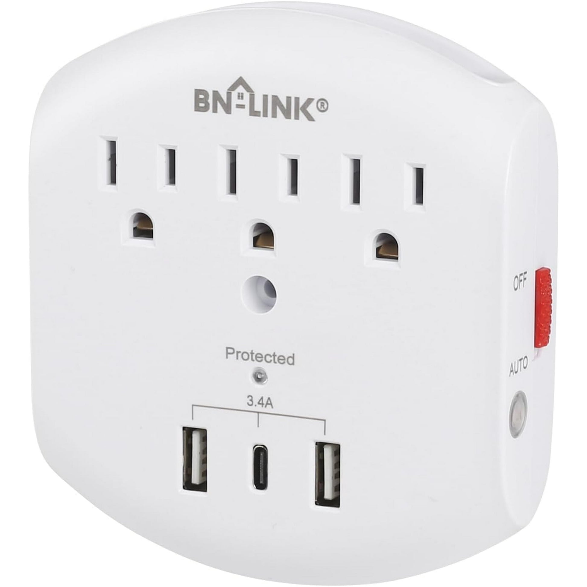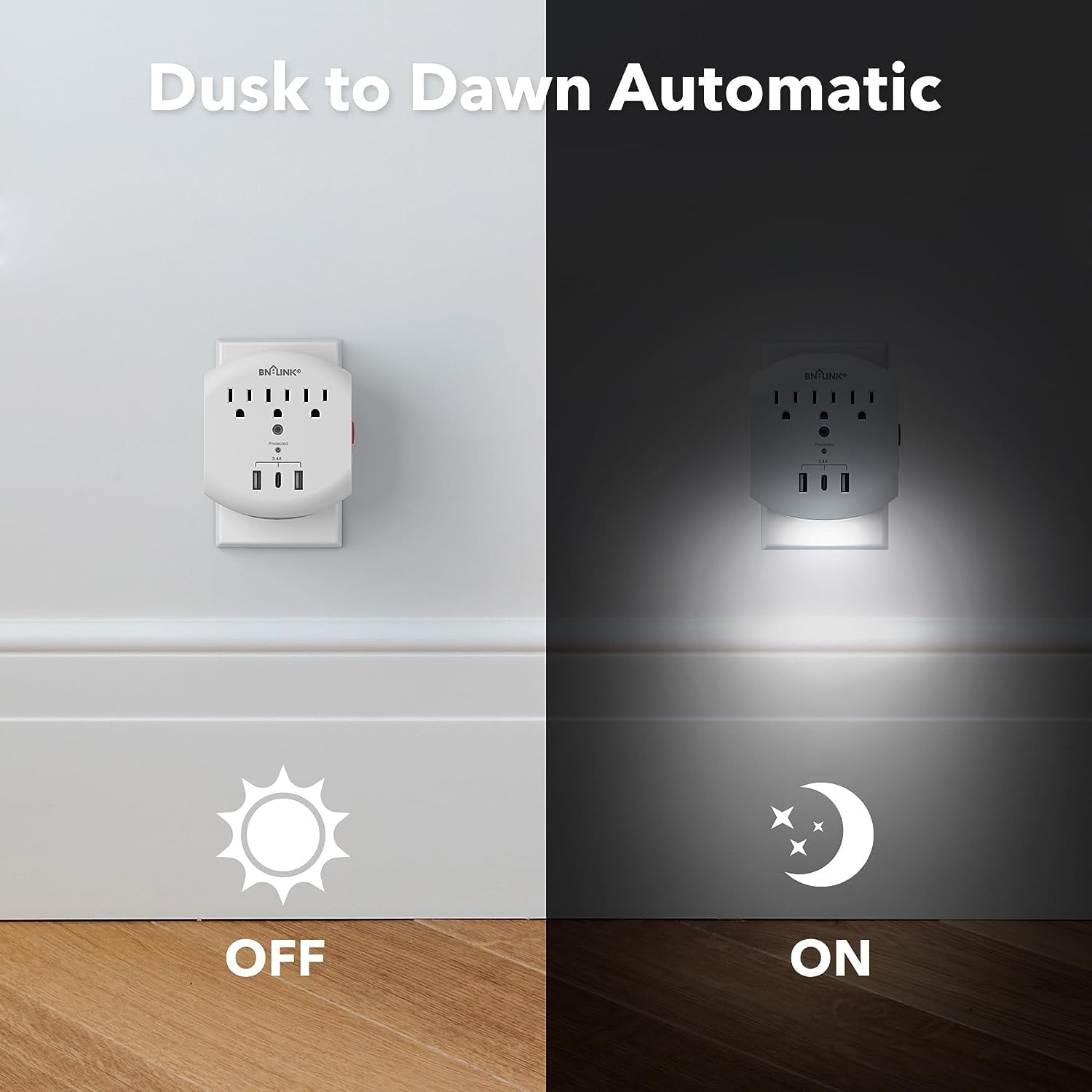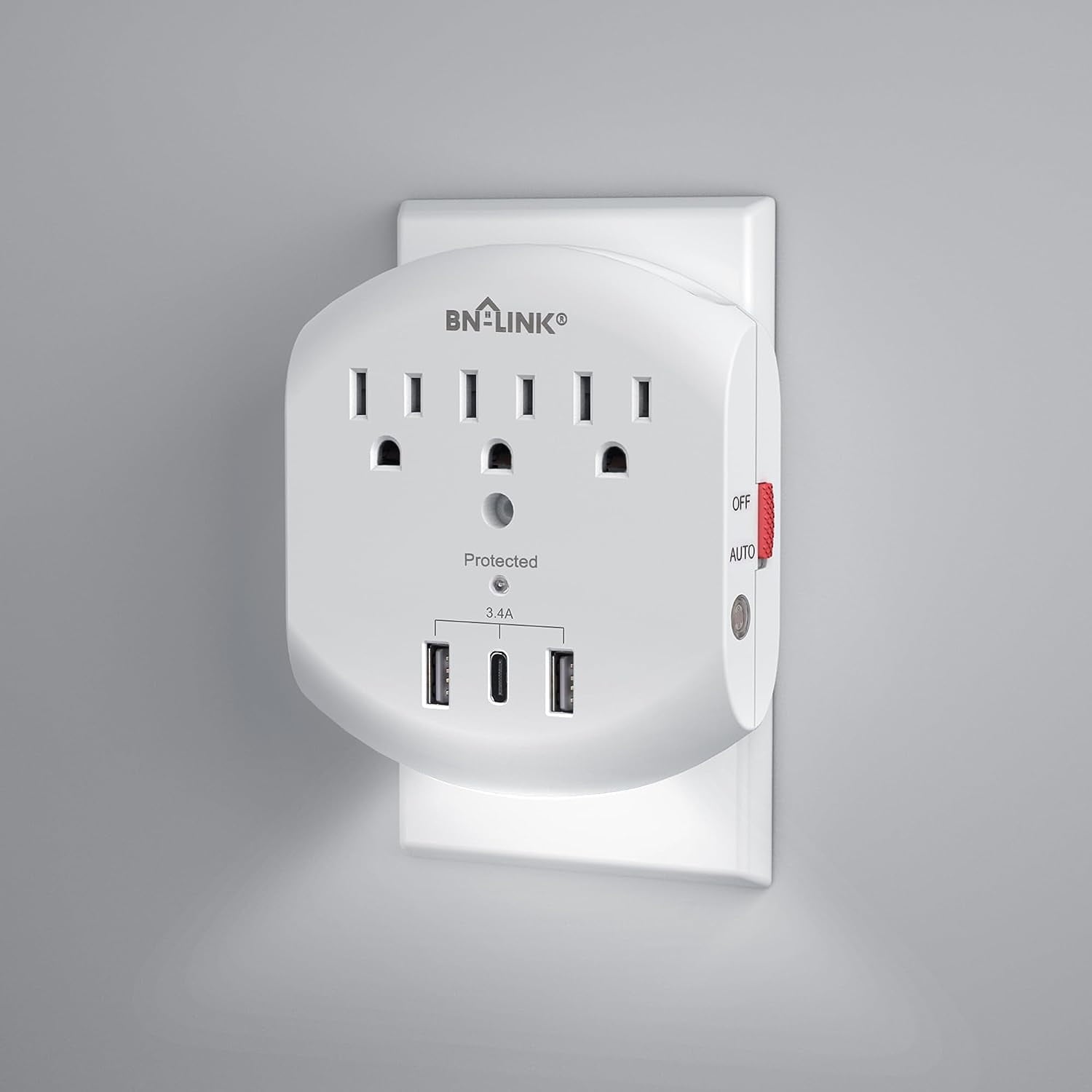 BN-LINK Multi Plug Outlet, USB Wall Charger Surge Protector with 3 Outlets, 3 USB Charging Ports(Total 3.4A) and Auto Sensor LED Night Light, Wall Plug Adapter for Traveling, Home, School, Office