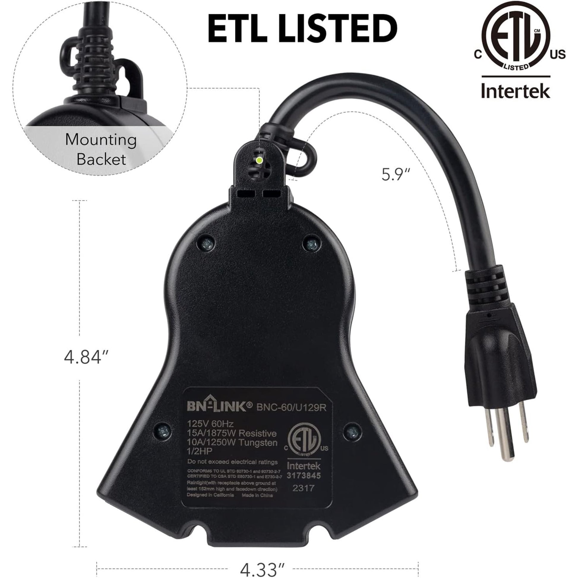 - ✓ SAFE & RELIABLE: Our outdoor timer is ETL listed and rigorously tested for quality control and safety. Conforms to UL Std No. 60730-1,60730-2-1. Rated 125V, 60Hz, 1875W, 15A Resistive & General Purpose 5A Tungsten.