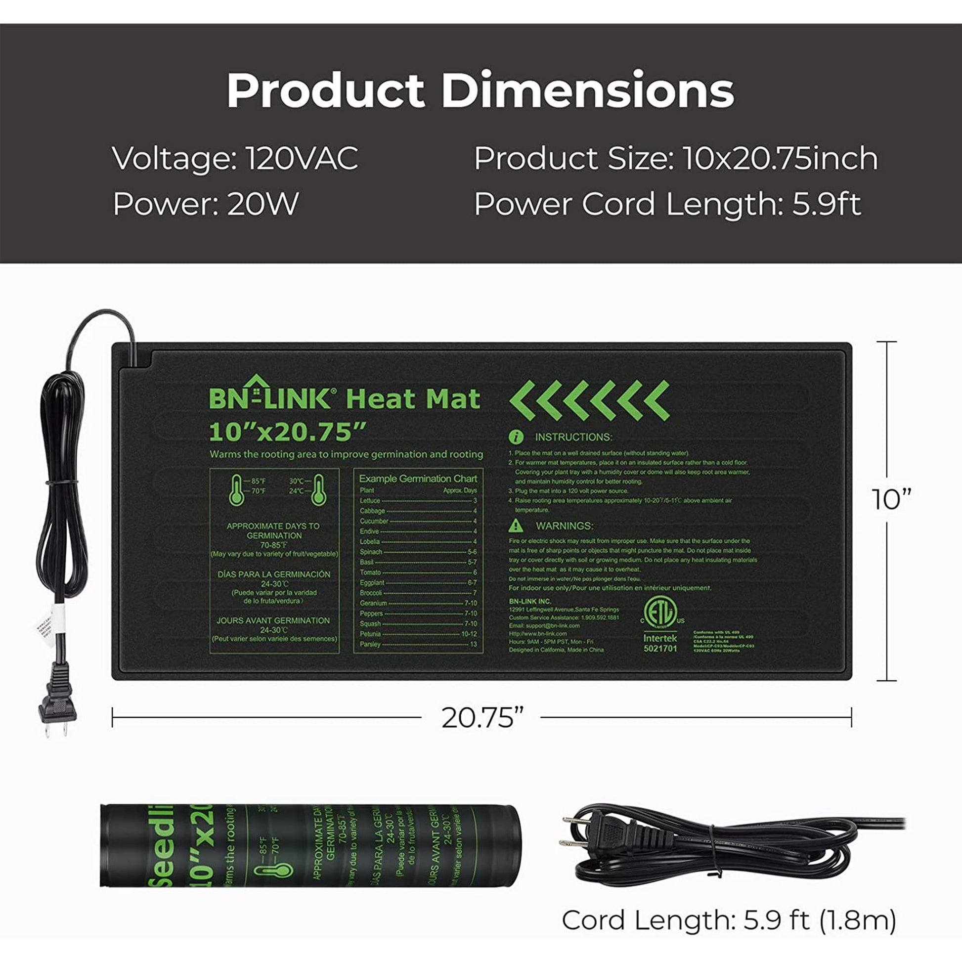 - GREAT SIZE AND SAFE: 10" x 20.75", 20 Watts. The mat is the perfect size for standard plastic growing tray. Each unit comes with BN-LINK’s strong 12-month warranty.