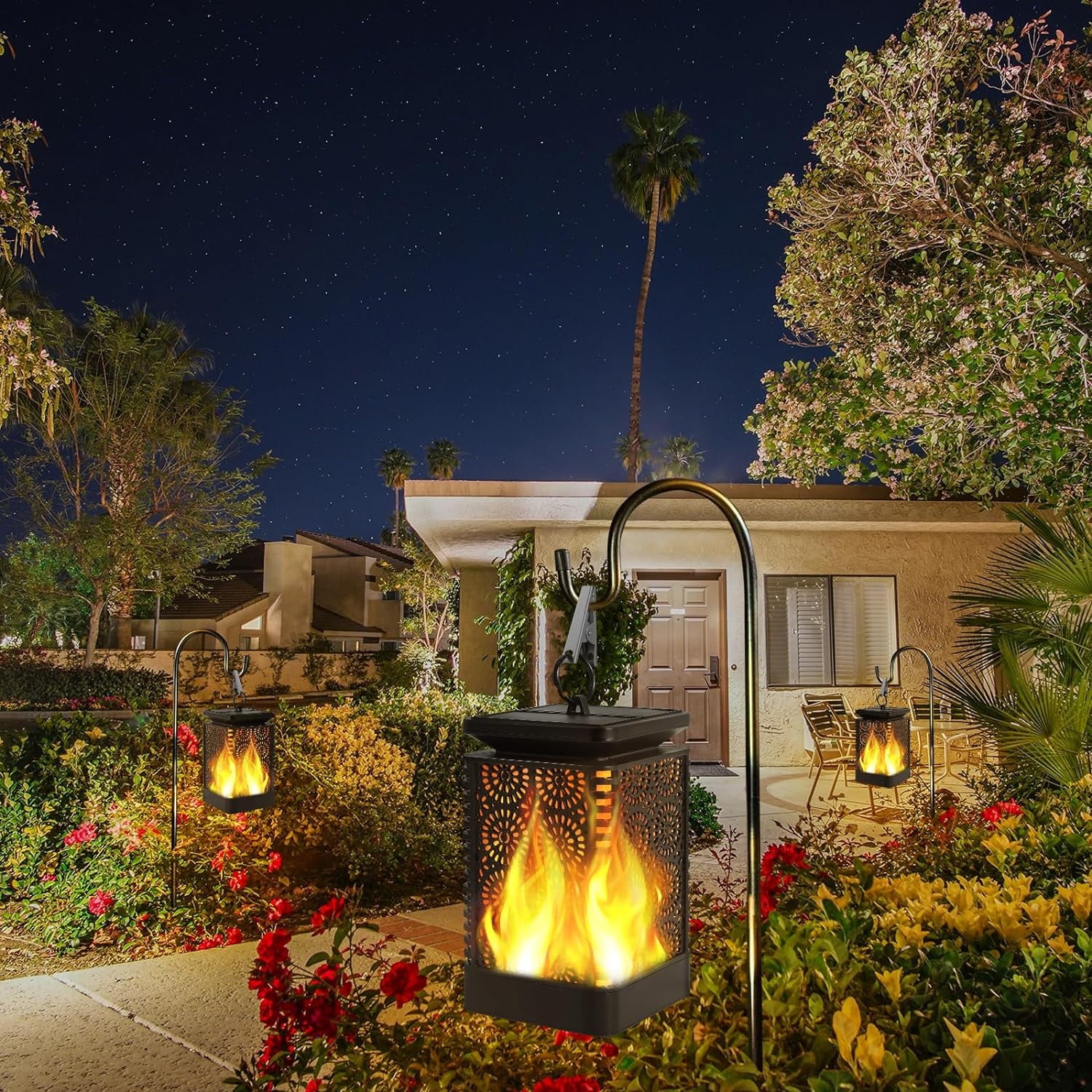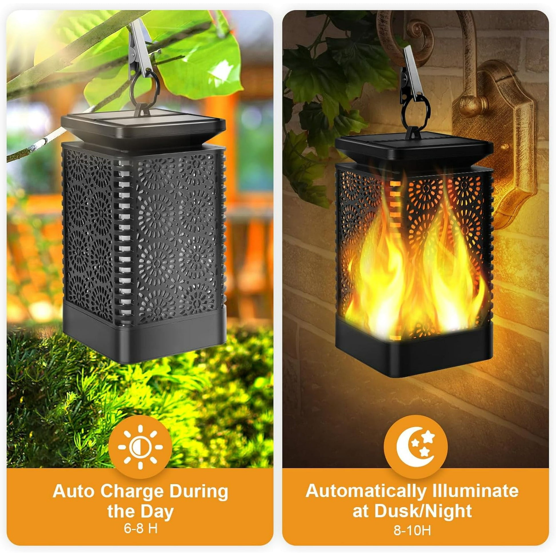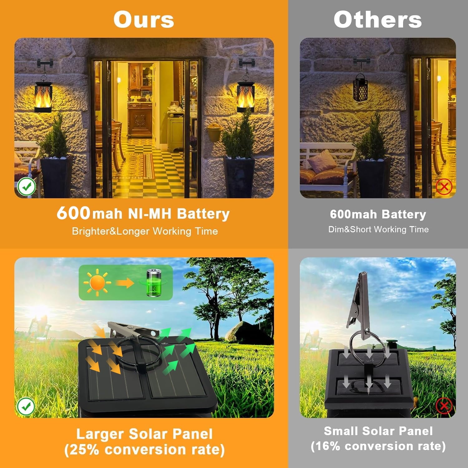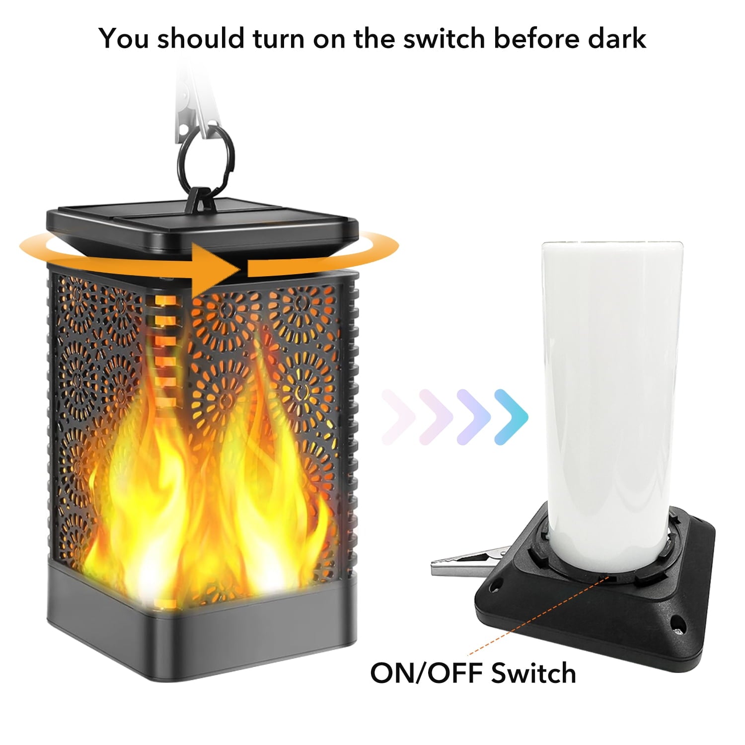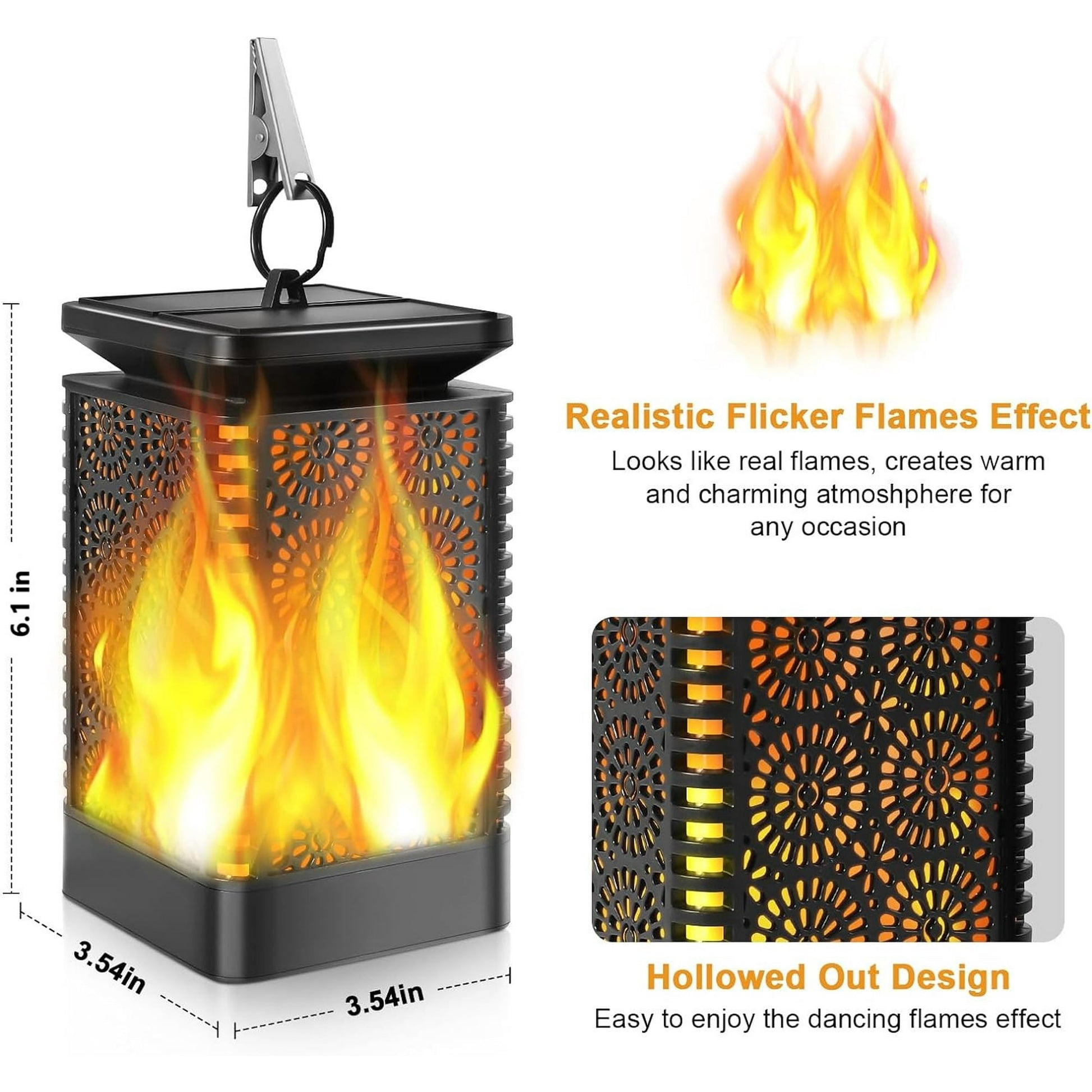 - Flickering Flames Design: The dancing flame design is attractive, which looks like the real flames; The warm yellow light creates a welcoming ambience. This flicker flame effect solar outdoor lights is decorative, which will be the best choice for alternative candle lanterns. Perfect addition for decorating gardens, patio, parties, balconies and yards.It is cool for Christmas and Halloween outdoor decorations.