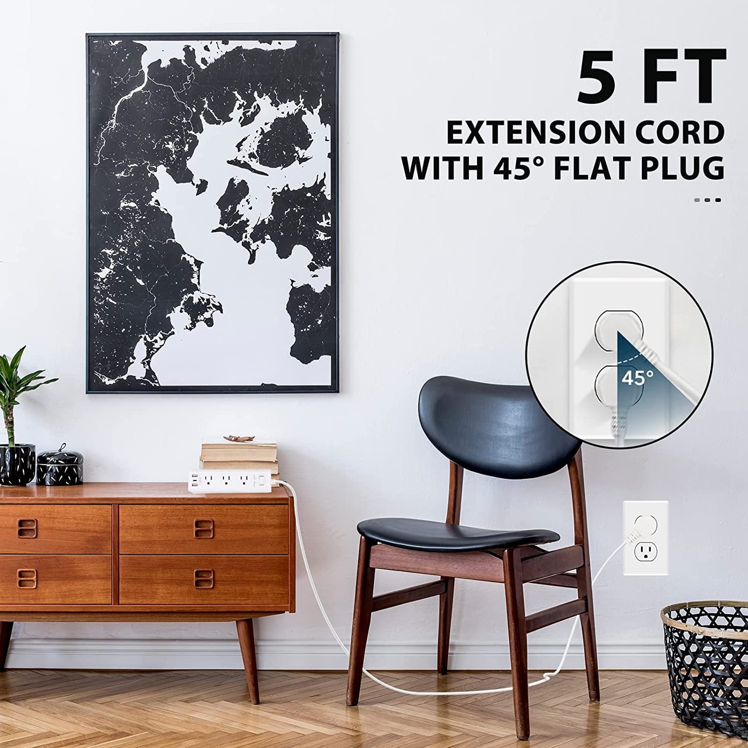- 【5 Ft Extension Cord with Right Angle Flat Plug】The 5ft extension cord gives you the flexibility to reach distant outlets and hard-to-reach places. Meanwhile, the low profile flat plug with 45 degree right-angle makes it easy to install in narrow corners or behind sofa, wardrobe, bookshelves, and other furnitures without blocking other outlets.