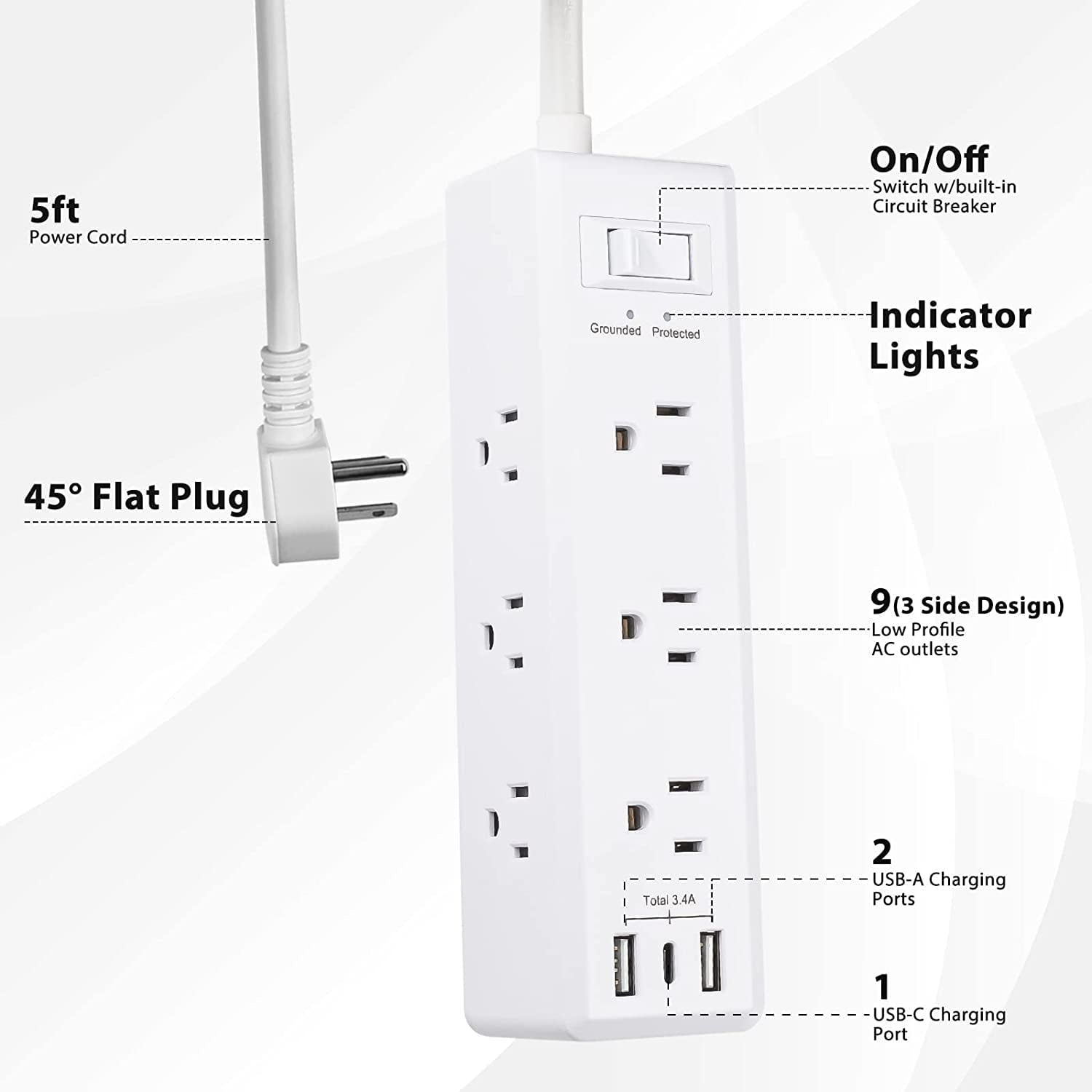 BN-LINK Surge Protector Power Strip with 9 Outlets 2 USB-A 1 USB-C (Total 3.4A), 3-Side Outlet Extender Strip with 5 Ft Extension Cord, Flat Plug, Desktop Charging Station for Travel, Home, Office