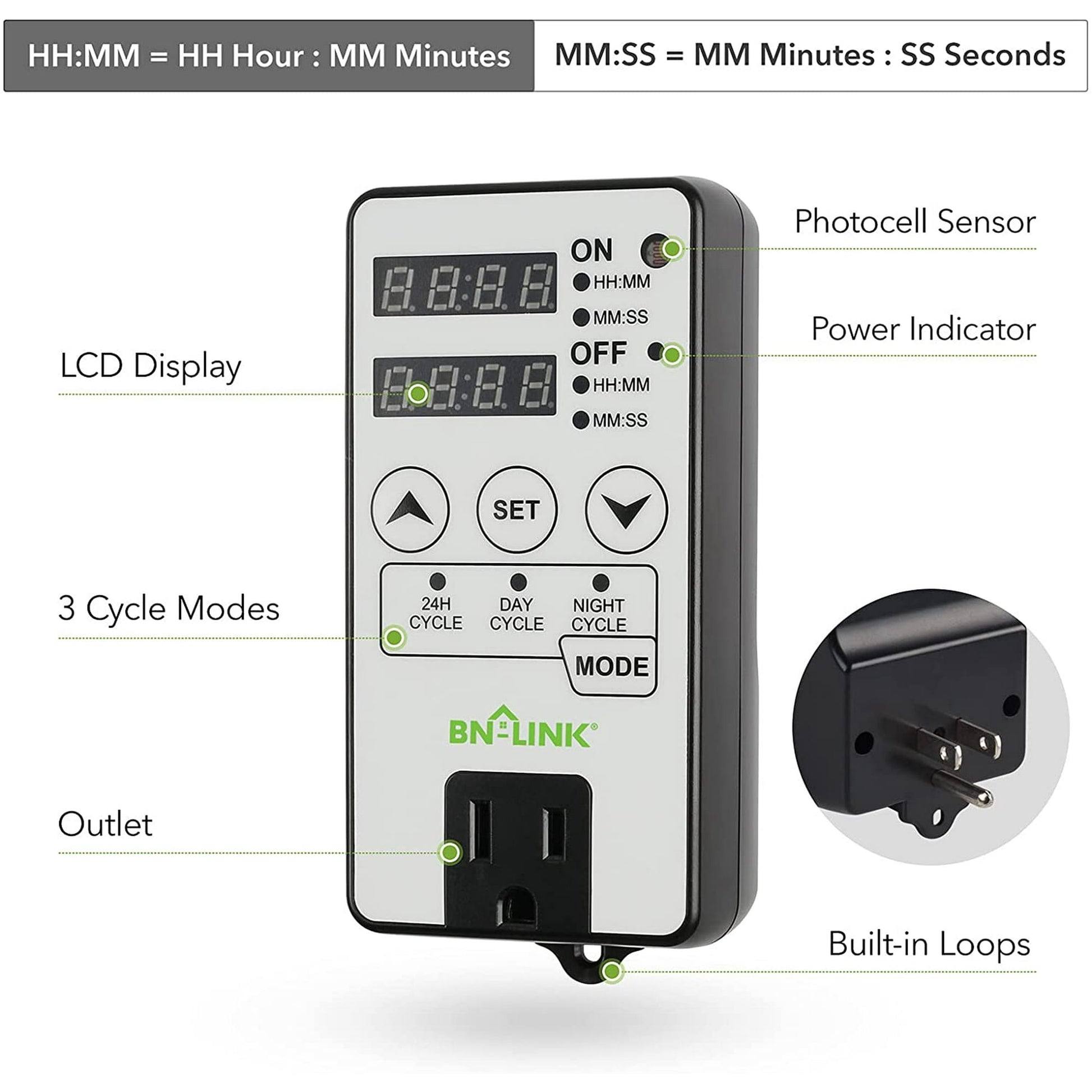Save energy and automate your devices using the BN-LINK Short Period Repeat Cycle Digital Timer. Equipped with a photocell sensor that can be operated in Day/Night/24 hour modes and repeat cycles of 1 second to 23:59 minutes (ON duration and OFF duration). Just set the designated on/off duration then the timer will continue to repeat the cycles to automate your appliances.Controls any 125V equipment requiring a device to be turned on and off at precise intervals. This timer has a wide range of uses including controlling hydroponic pumps, CO2 injection, turning on and off exhaust fans, and more. There is no programming required, it is easy to set and operate Cycle timing is adjustable for operation during the day, night, or 24 hours
