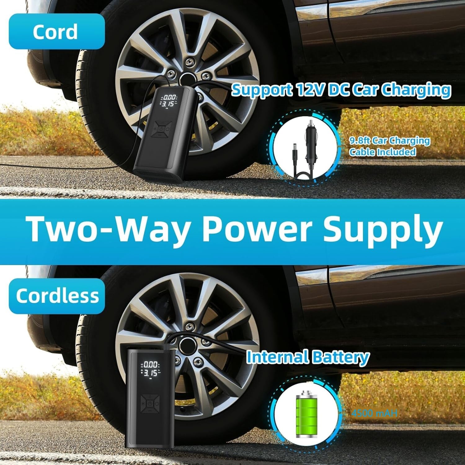 The BN-LINK air pump allows you to switch between cordless and power supply modes. Equipped with a high-capacity 4500mAh battery, In case the battery runs out, it comes with a 9.8 Ft DC 12V power cord that enables you to power by connecting it to the car. This ensures that you never have to worry about running out of power on the go.