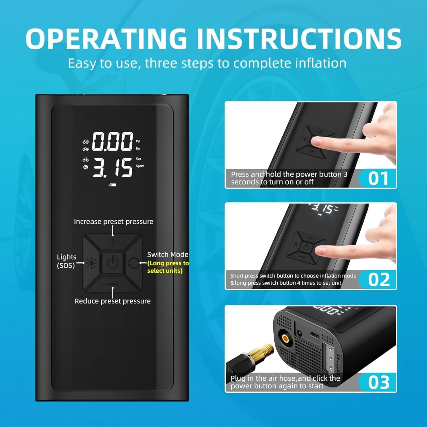 - 🚲【Accurate & Auto Shutoff for Safety】Easy to use and just follow 4 steps. (1) Long press power button to turn it on/off. (2) Long press switch button 4 times to select pressure unit such as PSI, kPa, BAR and KG/CM². (3) Press ‘+’ and ‘-’ button to easily select your desired pressure. (4) Short press power button to start. It can monitor real-time tire pressure and will shut off automatically while reaching given pressure.