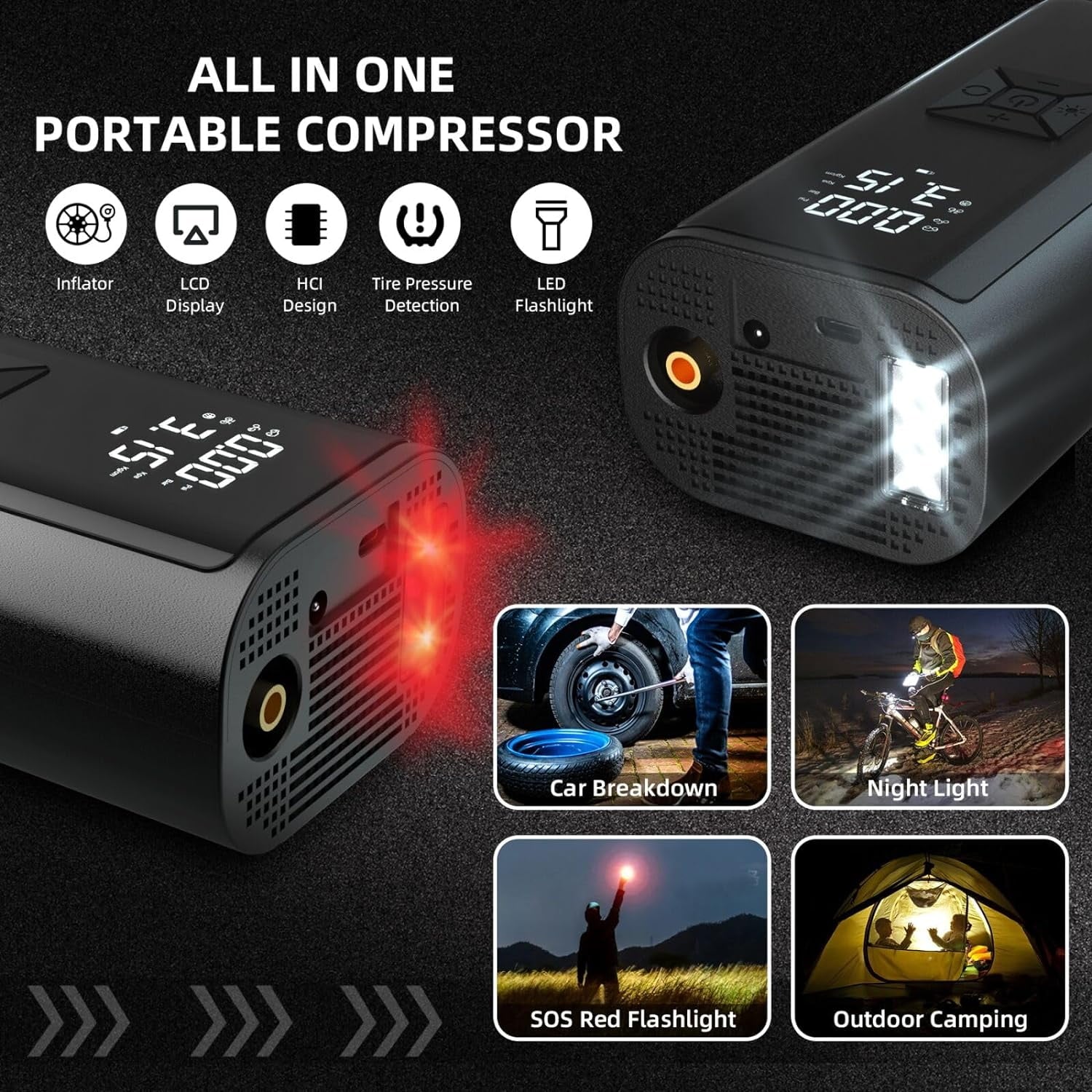 - 🚲【5 Smart Modes & LED Flashlight】Great car accessories, just short press switch button 5 times to select 4 types of preset inflation modes (bicycles, motorcycles, cars, and balls) which are convenient for beginners to choose and 1 customized mode which allows you to set pressure value (3-150psi), meeting your various inflation needs. It also has white light which is helpful in the dark and SOS red light for emergencies.