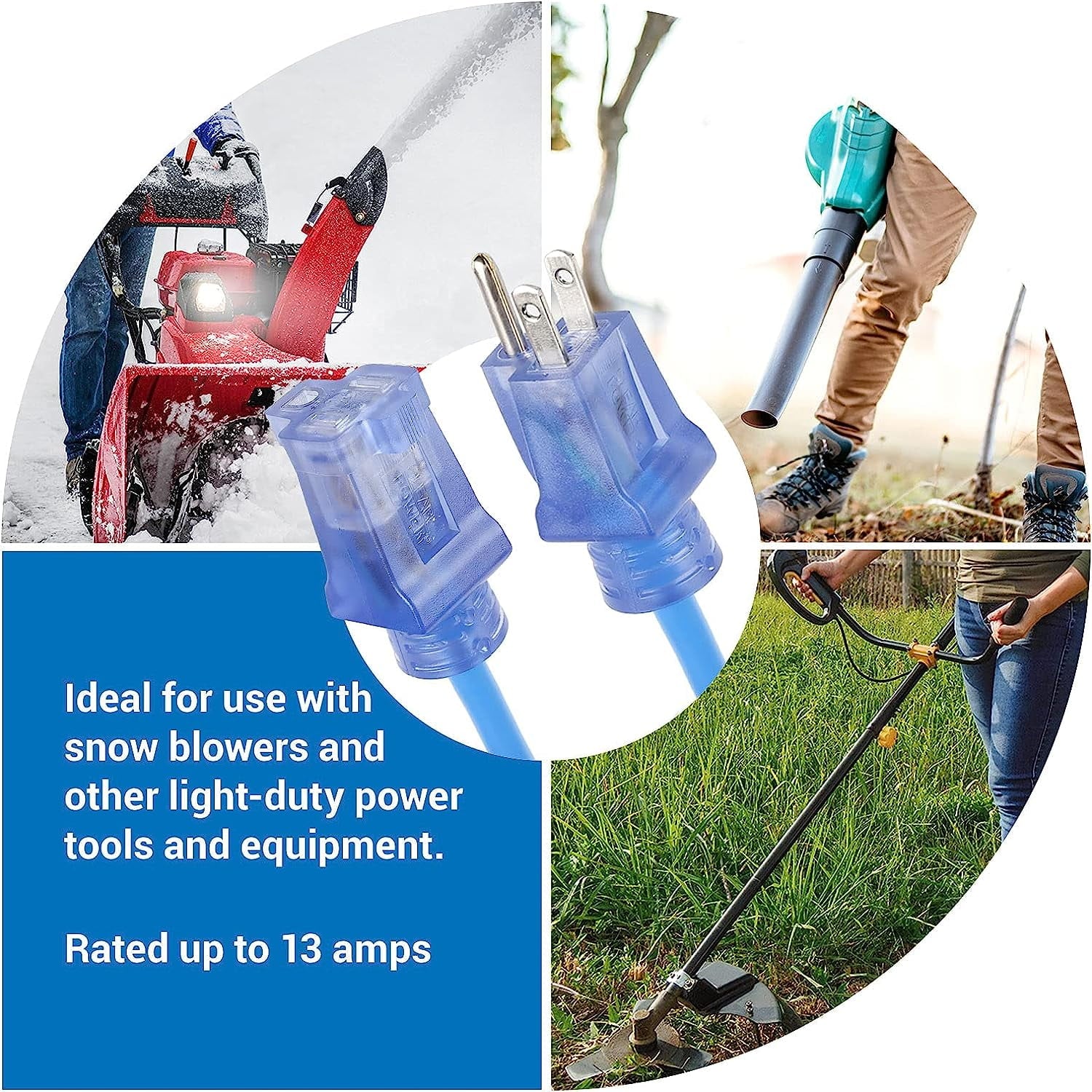 Clear Power DCOC-0074-DC 50 ft blue cold weather outdoor extension cord is perfect for extending the reach of your appliances, working in conditions where a normal cord will not. Its length will provide 50 ft of extended reach for any appliance so you can continue to power your work. Ideal for use with snow blowers and other power tools used in cold weather conditions.