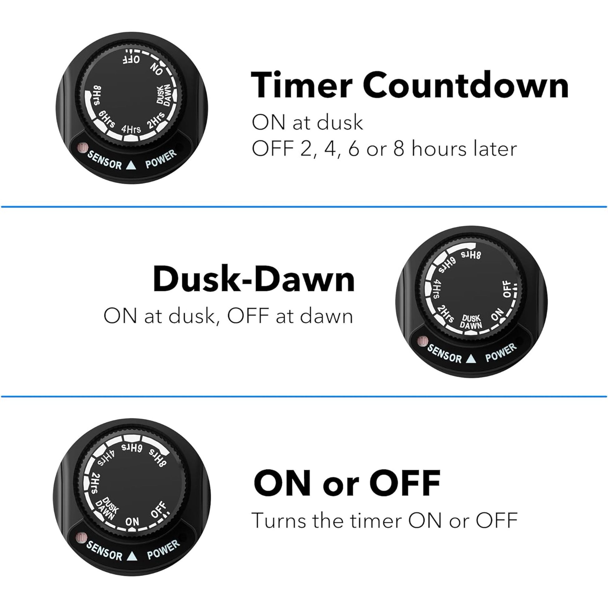 - 【Multiple Timer Functions】:Our outdoor light sensor timer including 4 countdown functions (ON at dusk, OFF after 2/4/6/8 hours), 2 switch functions (always on/off), 1 Photocell Sensor function (ON at dusk, OFF at dawn).