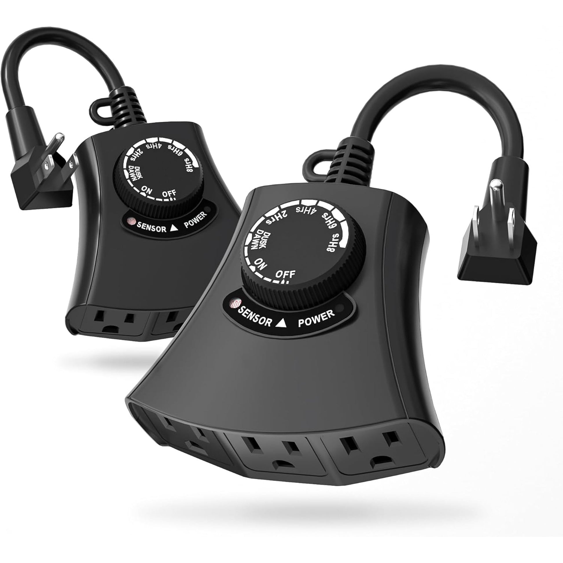 HBN Outdoor Light Timer Waterproof, Weatherproof Photocell Dusk to Dawn Light Sensor Timer 2/4/6/8 Countdown Timer, 3 Grounded Outlet for Christmas Lights,Hallowen Deceration,1875W 15A 1/2HP(2pack)