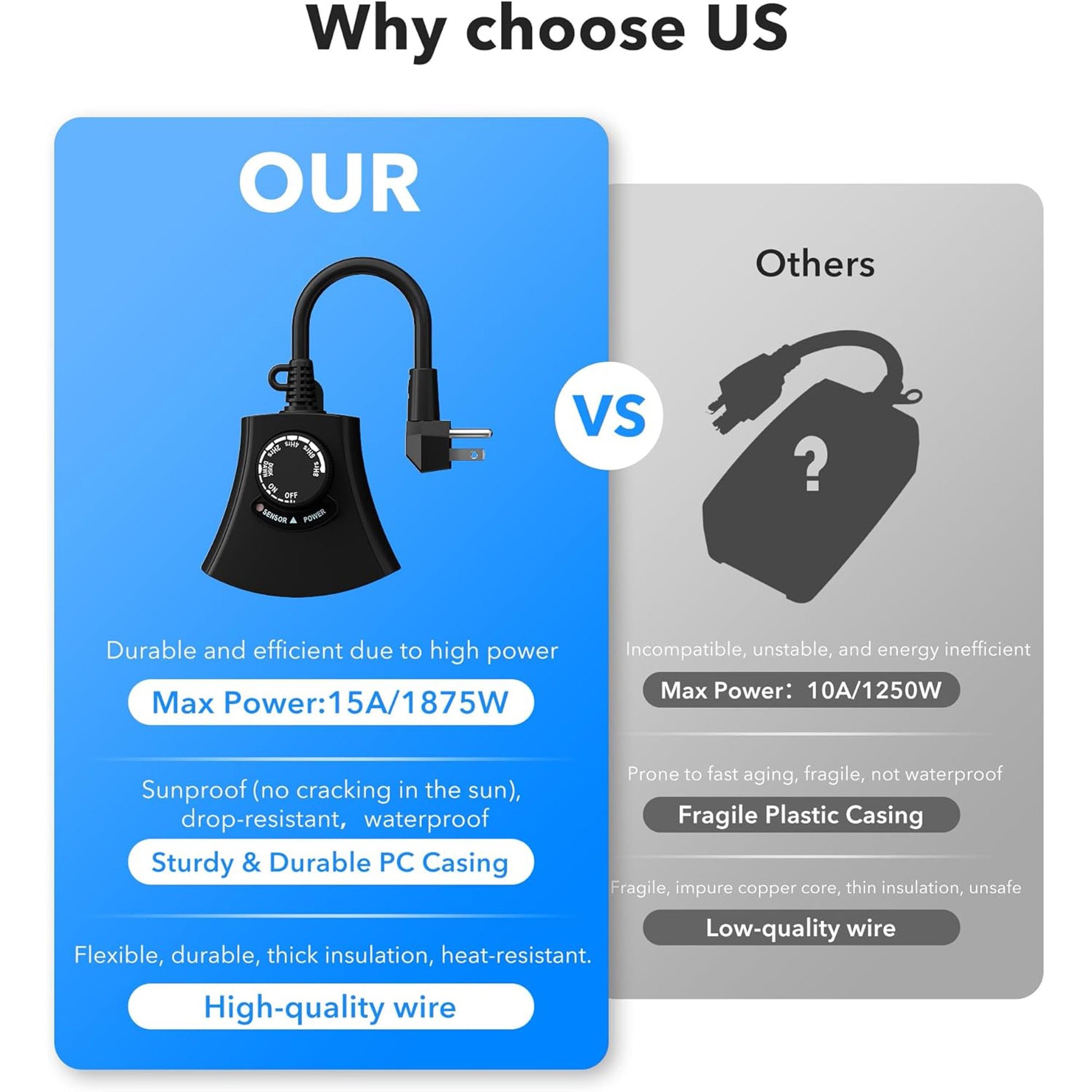 - 【Photocell Light Sensor】Our outdoor timer has a built-in light sensor that senses dusk/darkness and automatically turns your lights on/off, which can help you easily control outdoor equipment such as outdoor garden,Hallowen landscape lights, Christmas string lights,pool pumps, fountains, and outdoor string lights.