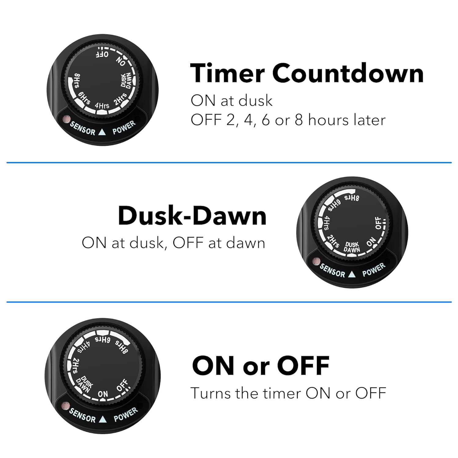 ✅【Multiple Timer Functions】:Our outdoor light sensor timer including 4 countdown functions (ON at dusk, OFF after 2/4/6/8 hours), 2 switch functions (always on/off), 1 Photocell Sensor function (ON at dusk, OFF at dawn).