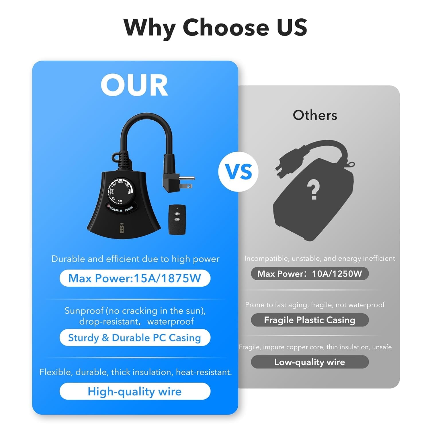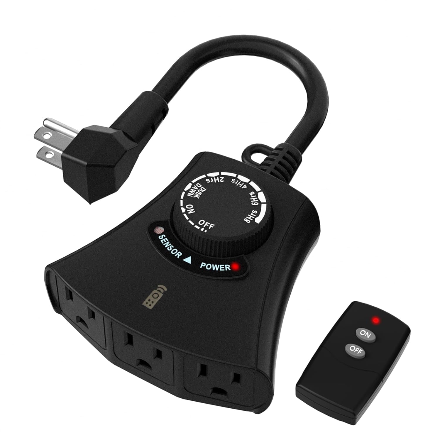 ✅【Remote Control】:This light timer outdoor weatherproof device features a 6-inch cord and 3 grounded outlets. The remote's robust RF signal can penetrate walls and doors, reaching up to 100ft in direct line of sight. All 3 outlets function simultaneously, not separately.