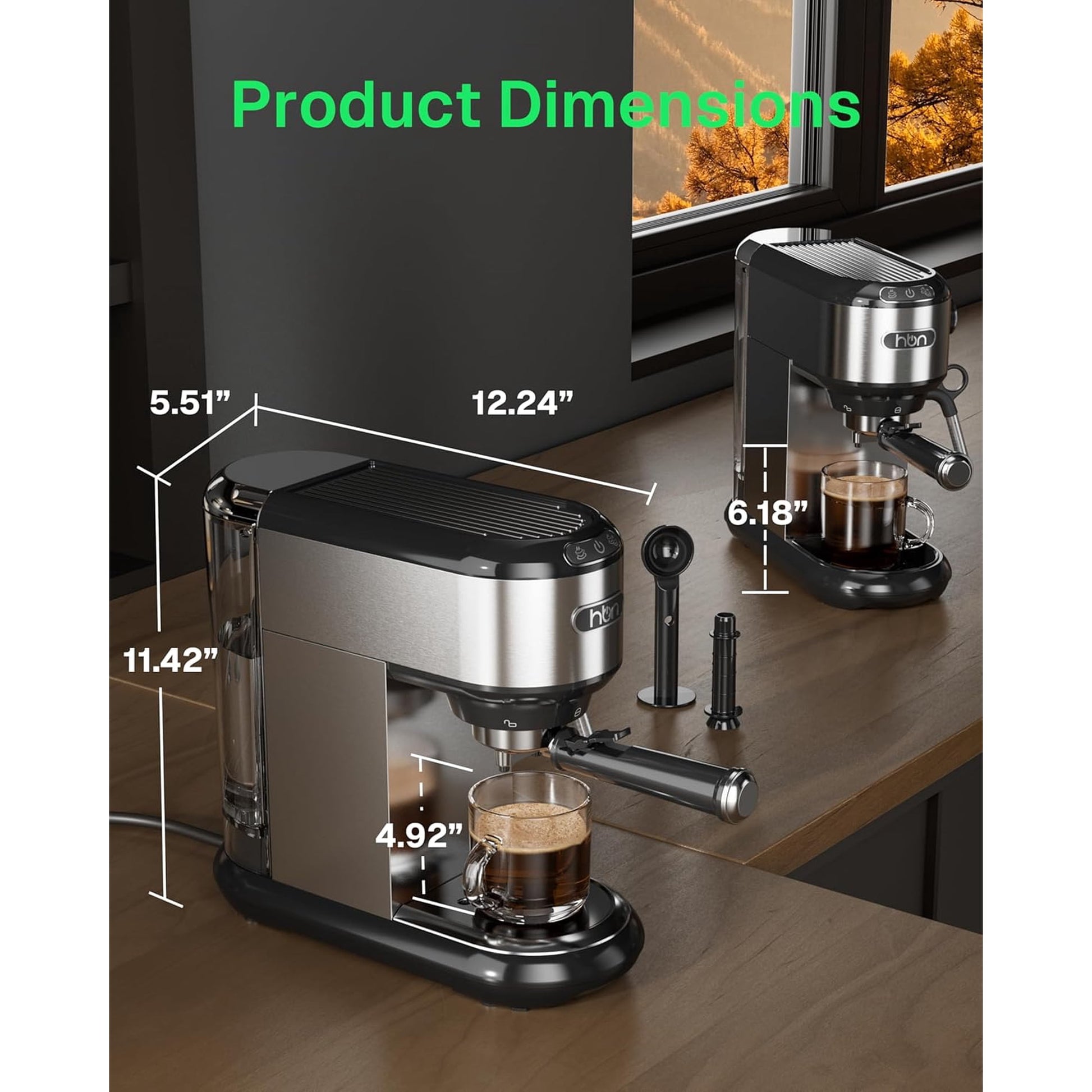 This HBN espresso machine delivers rich, full-flavored espresso with a professional milk frother for lattes, cappuccinos, and specialty drinks. The sleek stainless steel design adds a modern touch while offering durability and performance that fit seamlessly into any kitchen.