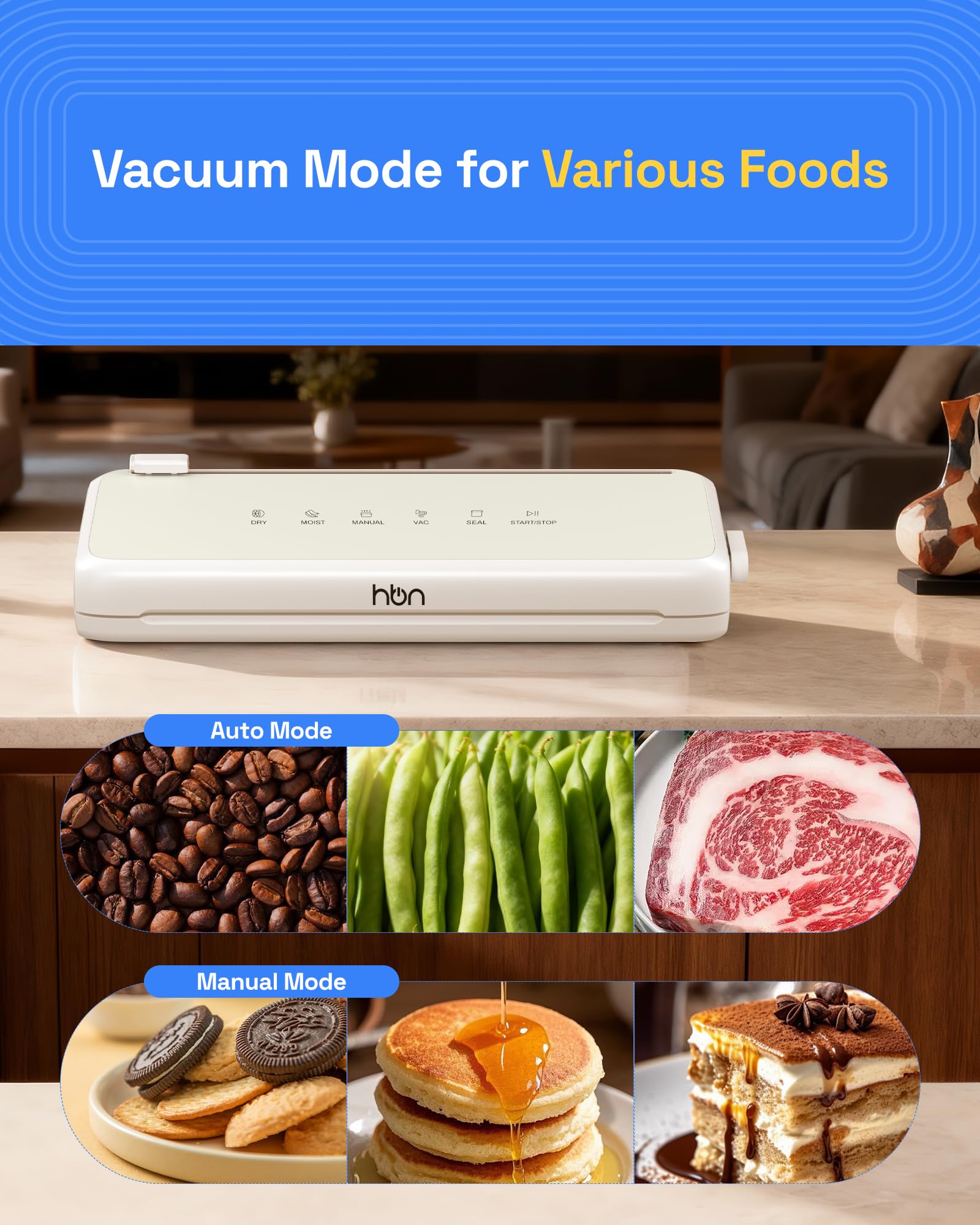 - 【ALL-IN-ONE Food Vacuum Sealer】With Dry, Moist, Manual, Vac and Seal modes, this food sealer machine handles dry snacks, moist or marinated foods and custom vacuum levels, making it a versatile vacuum packing machine for food in a home kitchen.