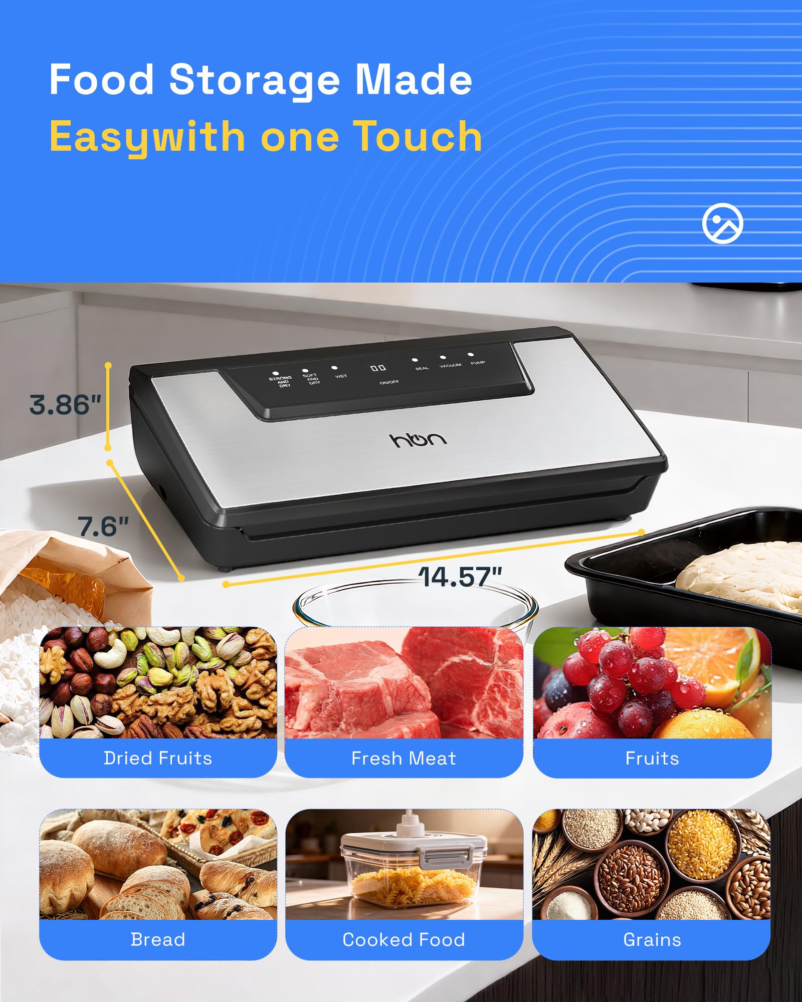 HBN Vacuum Sealer Machine features compact,powerful suction and multi-function versatility,it keeps meats,seafood,fruits,drygoods,and more,perfectly preserved. Locking in flavour,extending shelf life,while saving space and reducing waste.