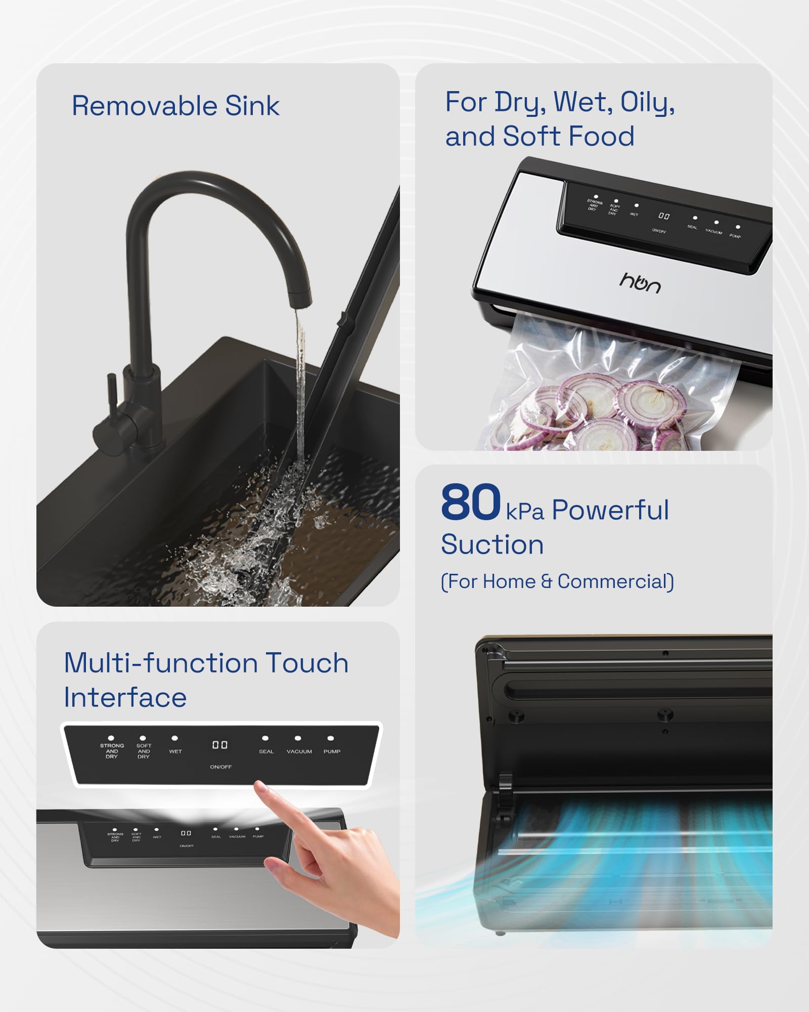 - 【BUILT-IN Cutter, Bag Storage & Removable Sink】Built-in cutter and roll bag storage make it easy to customize vacuum sealer bags. The removable sink helps catch drips and is simple to clean. Compatible with vacuum bags and vacuum containers via the included hose.
