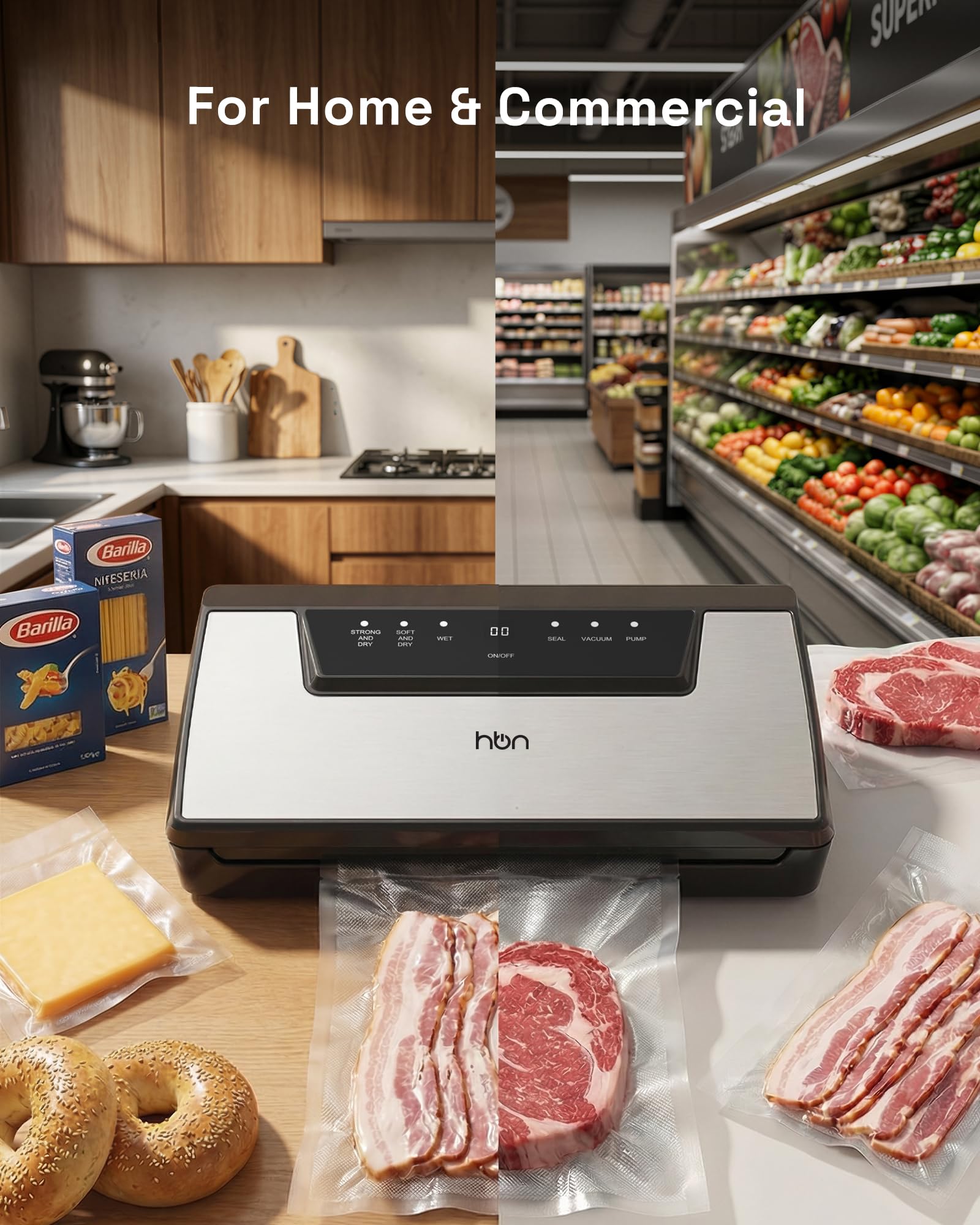 - 【REAL 80KPa Vacuum Power for Home & Commercial Use】High-efficiency pump delivers up to -80kPa strong suction to keep food fresh longer, making it suitable for both home and commercial kitchens. Designed for long duty cycles, it can run for hours to seal large batches of food without loss of sealing quality.